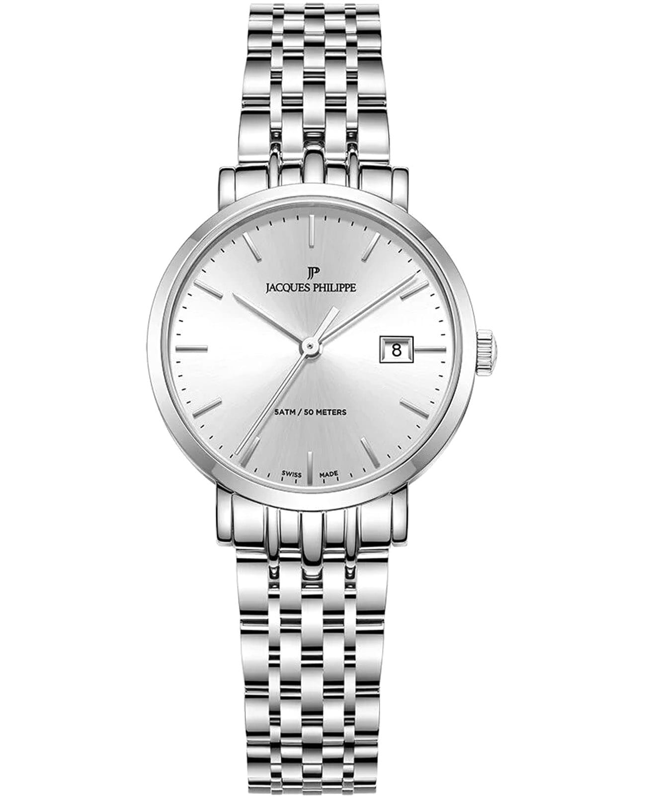 Швейцарские женские часы Jacques Philippe Ligata JPQLS941326 кварцевый механизм с высокой точностью. Прочное сапфировое стеклоСапфировое стеклоПрочный и надёжный материал из кристалла сапфира синтетического происхождения, характеризующийся особой твёрдостью и устойчивостью к царапинам и повреждениям. устойчивое к царапинам и механическим повреждениям. Циферблат серебристого цвета украшен классическими стрелками и метками, что гармонично дополняет общий дизайн модели. Элегантный корпус изготовлен из нержавеющей стали, диаметром 29 мм, что делает их устойчивыми к внешним воздействиям и придает благородный вид. Стальной браслет на застёжке-бабочке с кнопкамиЗастёжка "бабочка"Такой вид застёжки дополняется предохранителями, помогающими избежать случайного раскрытия браслета. Обладают изящным исполнением. обеспечивает комфортное и безопасное ношение. Окошко даты находится в положении 3 часа. Класс водозащиты: 50 метров позволит защитить корпус от случайных брызг или капель дождя. Эти часы станут идеальным выбором для женщин, ценящих стиль, качество и функциональность и элегантность.