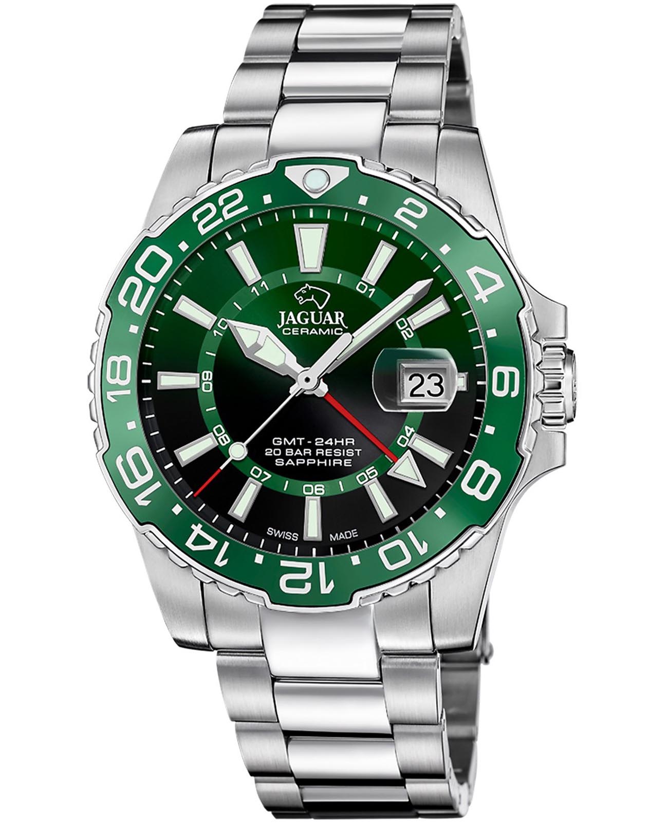 Мужские швейцарские часы Jaguar Ceramic GMT J1011/3. Кварцевый швейцарский калибр Ronda 515.24H. Сапфировое стеклоСапфировое стеклоПрочный и надёжный материал из кристалла сапфира синтетического происхождения, характеризующийся особой твёрдостью и устойчивостью к царапинам и повреждениям. устойчивое к мелким механическим повреждениям. Корпус и браслет часов изготовлены из нержавеющей стали. Стрелки и метки с люминесцентным покрытиемЛюминесцентное покрытиеПозволяет считывать показания времени в темноте. Производители наносят на стрелки, часовые индексы, безель или поверхность циферблата светонакопительный состав, дающий холодное свечение.. Окошко даты находится в положении 3 часа. Класс водозащиты: 200 метров, позволит плавать, нырять и заниматься другими водными видами спорта. Стальной браслет на раскладной застёжкеРаскладная застёжкаТакой тип застёжки используется только на браслетах из металла. Она никогда не раскрывается полностью, происходит разделение на 2 и более частей. Раскладывающая застёжка снизит вероятность потери часов к минимуму.. Дополнительная центральная стрелка для второго часового пояса. Вращающийся безельБезельВнешний ободок, закрепляющий стекло. В спортивных часах так называется поворотное кольцо с делениями на циферблате, выполняет роль таймера – замеряет отрезки времени на шкале. Неподвижный безель – элемент декора. Однонаправленно вращающийся безель на дайверских часах позволяет фиксировать моменты погружения и выныривания на поверхность. с боковым рифлением из нержавеющей стали и керамики.