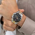 Мужские швейцарские часы-хронографХронографФункция позволяет измерять отрезки времени с особой точностью: часы, минуты, секунды. Верным признаком хронографа является наличие на циферблате 3 дополнительных окошек-счётчиков. Jaguar Executive Diver Chrono J862/2. Кварцевый швейцарский калибр Ronda 6003D. Сапфировое стеклоСапфировое стеклоПрочный и надёжный материал из кристалла сапфира синтетического происхождения, характеризующийся особой твёрдостью и устойчивостью к царапинам и повреждениям. устойчивое к мелким механическим повреждениям. Корпус часов изготовлен из нержавеющей стали. Стрелки и метки с люминесцентным покрытиемЛюминесцентное покрытиеПозволяет считывать показания времени в темноте. Производители наносят на стрелки, часовые индексы, безель или поверхность циферблата светонакопительный состав, дающий холодное свечение.. Окошко даты находится в положении между «4» и «5 часами». Класс водозащиты: 200 метров, позволит плавать, нырять и заниматься другими водными видами спорта. Стальной браслет с частичным PVD-покрытиемPVDУльтратонкое покрытие наносится в технике вакуумного напыления, сочетает в себе нитрид титана особой прочности со слоем золота или оксида хрома. Несёт в себе декоративную или защитную функцию. на раскладной застёжкеРаскладная застёжкаТакой тип застёжки используется только на браслетах из металла. Она никогда не раскрывается полностью, происходит разделение на 2 и более частей. Раскладывающая застёжка снизит вероятность потери часов к минимуму.. БезельБезельВнешний ободок, закрепляющий стекло. В спортивных часах так называется поворотное кольцо с делениями на циферблате, выполняет роль таймера – замеряет отрезки времени на шкале. Неподвижный безель – элемент декора. Однонаправленно вращающийся безель на дайверских часах позволяет фиксировать моменты погружения и выныривания на поверхность. с PVD-покрытиемPVDУльтратонкое покрытие наносится в технике вакуумного напыления, сочетает в себе нитрид титана особой прочности со слоем золота или оксида хрома. Несёт в себе декоративную или защитную функцию..