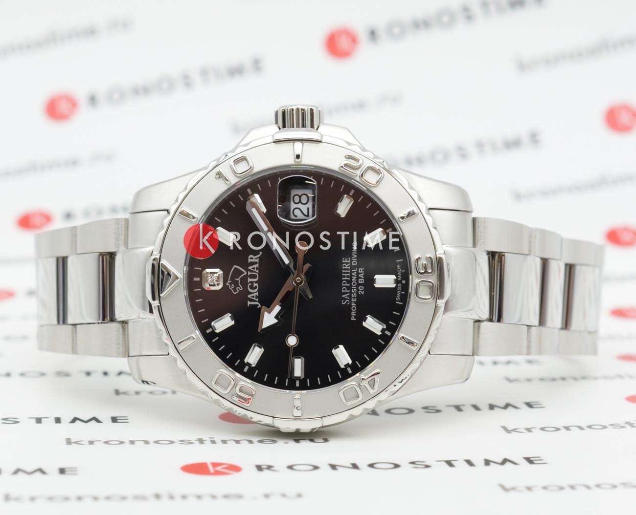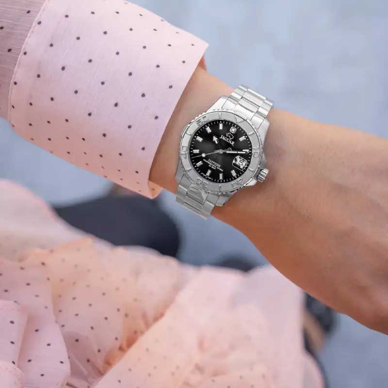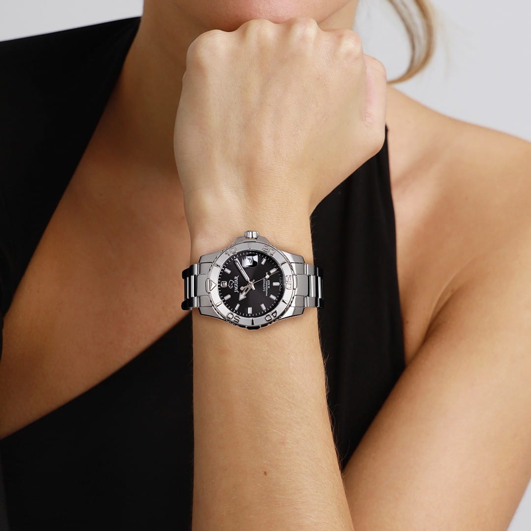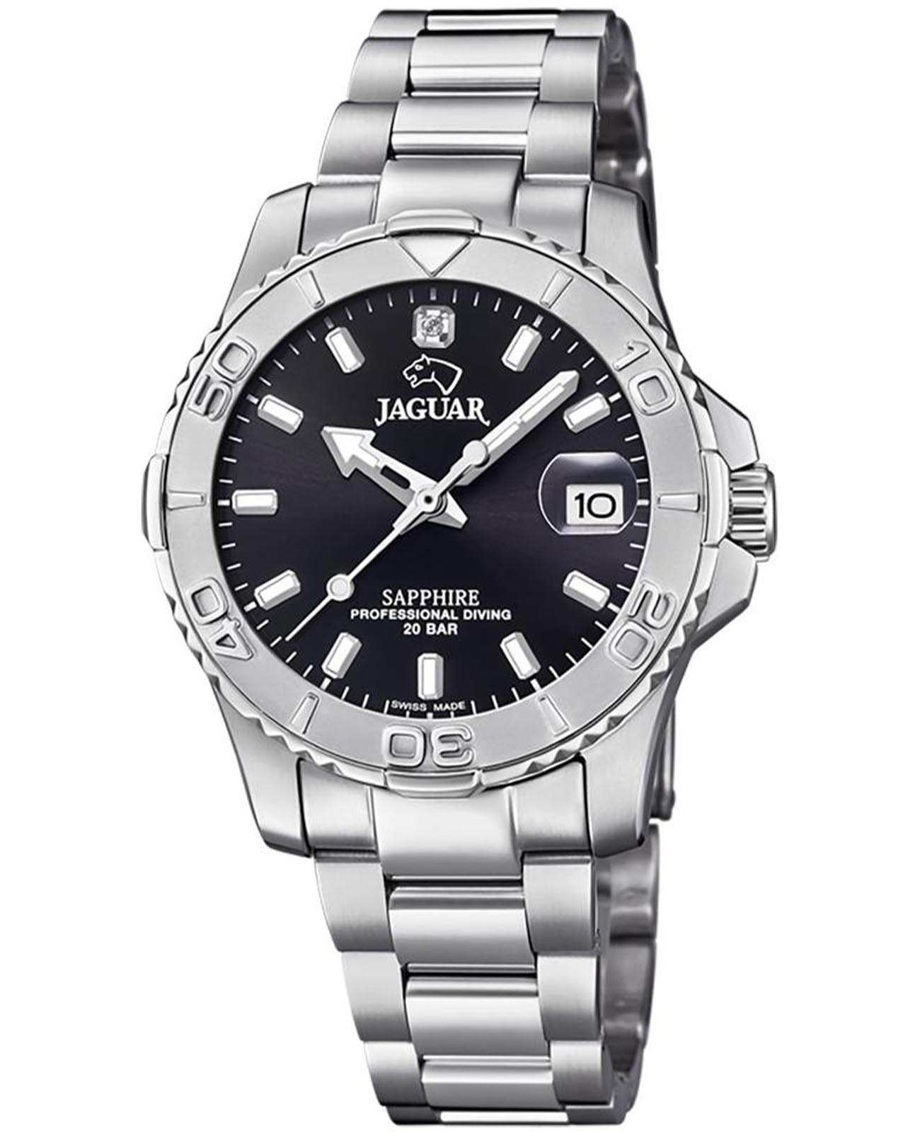 Женские швейцарские часы Jaguar Couple Diver J870/4. Кварцевый швейцарский калибр Ronda 705. Сапфировое стеклоСапфировое стеклоПрочный и надёжный материал из кристалла сапфира синтетического происхождения, характеризующийся особой твёрдостью и устойчивостью к царапинам и повреждениям. устойчивое к мелким механическим повреждениям. Корпус и браслет часов изготовлены из нержавеющей стали. Стрелки и метки с люминесцентным покрытиемЛюминесцентное покрытиеПозволяет считывать показания времени в темноте. Производители наносят на стрелки, часовые индексы, безель или поверхность циферблата светонакопительный состав, дающий холодное свечение.. Окошко даты находится в положении 3 часа. Класс водозащиты: 200 метров, позволит плавать, нырять и заниматься другими водными видами спорта. Стальной браслет на раскладной застёжкеРаскладная застёжкаТакой тип застёжки используется только на браслетах из металла. Она никогда не раскрывается полностью, происходит разделение на 2 и более частей. Раскладывающая застёжка снизит вероятность потери часов к минимуму.. Циферблат украшен кристаллом.