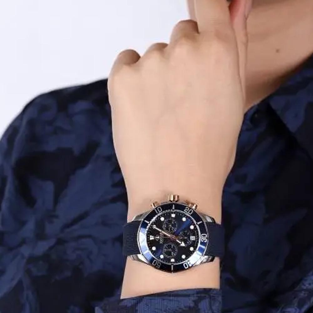 Женские швейцарские часы-хронографХронографФункция позволяет измерять отрезки времени с особой точностью: часы, минуты, секунды. Верным признаком хронографа является наличие на циферблате 3 дополнительных окошек-счётчиков. Jaguar Woman J890/4. Кварцевый швейцарский калибр Ronda 5030D. Сапфировое стеклоСапфировое стеклоПрочный и надёжный материал из кристалла сапфира синтетического происхождения, характеризующийся особой твёрдостью и устойчивостью к царапинам и повреждениям. устойчивое к мелким механическим повреждениям. Корпус часов изготовлен из нержавеющей стали. Стрелки и метки с люминесцентным покрытиемЛюминесцентное покрытиеПозволяет считывать показания времени в темноте. Производители наносят на стрелки, часовые индексы, безель или поверхность циферблата светонакопительный состав, дающий холодное свечение.. Окошко даты находится в положении 6 часов. Класс водозащиты: 200 метров, позволит плавать, нырять и заниматься другими водными видами спорта. Силиконовый ремешок на стандартной застёжке. БезельБезельВнешний ободок, закрепляющий стекло. В спортивных часах так называется поворотное кольцо с делениями на циферблате, выполняет роль таймера – замеряет отрезки времени на шкале. Неподвижный безель – элемент декора. Однонаправленно вращающийся безель на дайверских часах позволяет фиксировать моменты погружения и выныривания на поверхность. с PVD-покрытиемPVDУльтратонкое покрытие наносится в технике вакуумного напыления, сочетает в себе нитрид титана особой прочности со слоем золота или оксида хрома. Несёт в себе декоративную или защитную функцию..