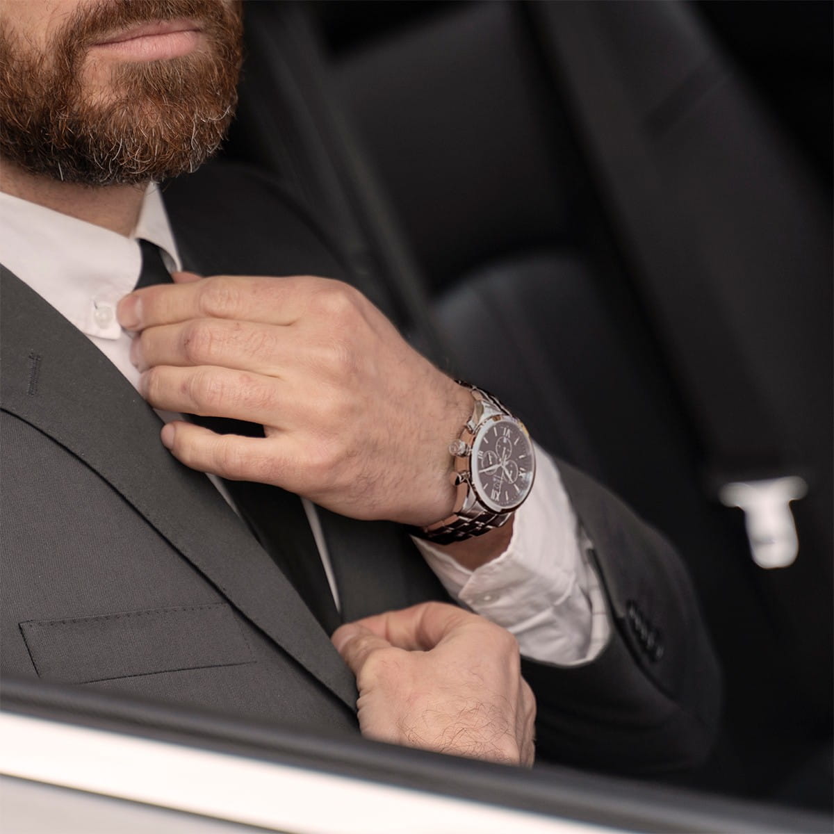 Мужские швейцарские часы-хронографХронографФункция позволяет измерять отрезки времени с особой точностью: часы, минуты, секунды. Верным признаком хронографа является наличие на циферблате 3 дополнительных окошек-счётчиков. Jaguar Acamar J963/4. Кварцевый швейцарский калибр Ronda 5030D. Сапфировое стеклоСапфировое стеклоПрочный и надёжный материал из кристалла сапфира синтетического происхождения, характеризующийся особой твёрдостью и устойчивостью к царапинам и повреждениям. устойчивое к мелким механическим повреждениям. Корпус и браслет часов изготовлены из нержавеющей стали. Окошко даты находится в положении 6 часов. Класс водозащиты: 100 метров, позволит плавать, нырять и заниматься другими водными видами спорта. Стальной браслет на раскладной застёжкеРаскладная застёжкаТакой тип застёжки используется только на браслетах из металла. Она никогда не раскрывается полностью, происходит разделение на 2 и более частей. Раскладывающая застёжка снизит вероятность потери часов к минимуму..