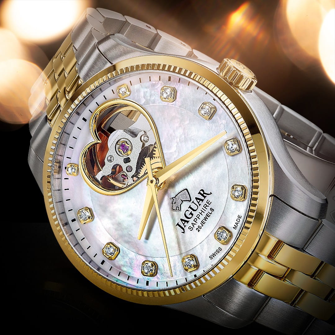 Женские швейцарские часы Jaguar Automatic Open Heart J995/1, механизм — автоподзавод. В часах с автоподзаводом заводная головка практически не используется, что исключает истирание ее материала и материала корпуса. Сапфировое стеклоСапфировое стеклоПрочный и надёжный материал из кристалла сапфира синтетического происхождения, характеризующийся особой твёрдостью и устойчивостью к царапинам и повреждениям. устойчивое к мелким механическим повреждениям. Корпус часов изготовлен из нержавеющей стали. Класс водозащиты: 50 метров, позволит защитить корпус от случайных брызг или капель дождя. Стальной браслет с частичным PVD-покрытиемPVDУльтратонкое покрытие наносится в технике вакуумного напыления, сочетает в себе нитрид титана особой прочности со слоем золота или оксида хрома. Несёт в себе декоративную или защитную функцию. на застёжке-бабочке с кнопкамиЗастёжка "бабочка"Такой вид застёжки дополняется предохранителями, помогающими избежать случайного раскрытия браслета. Обладают изящным исполнением. . Циферблат украшен кристаллами в роли часовых индексов, крупная апертура в виде сердца, открывающая обзор на балансовое колесо механизма. БезельБезельВнешний ободок, закрепляющий стекло. В спортивных часах так называется поворотное кольцо с делениями на циферблате, выполняет роль таймера – замеряет отрезки времени на шкале. Неподвижный безель – элемент декора. Однонаправленно вращающийся безель на дайверских часах позволяет фиксировать моменты погружения и выныривания на поверхность. с PVD-покрытиемPVDУльтратонкое покрытие наносится в технике вакуумного напыления, сочетает в себе нитрид титана особой прочности со слоем золота или оксида хрома. Несёт в себе декоративную или защитную функцию..