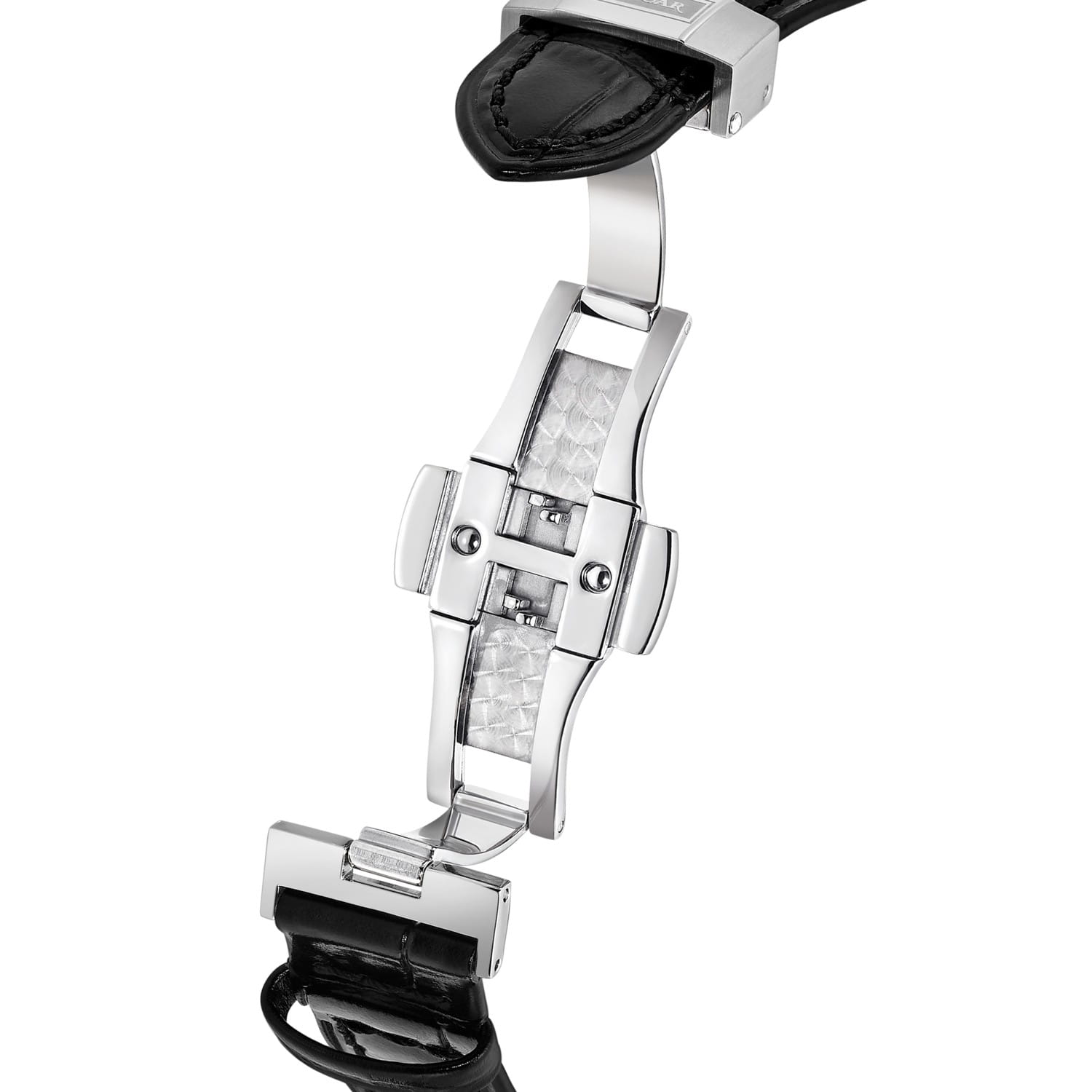 Женские швейцарские часы Jaguar Automatic Woman J998/A, механизм — автоподзавод. В часах с автоподзаводом заводная головка практически не используется, что исключает истирание ее материала и материала корпуса. Сапфировое стеклоСапфировое стеклоПрочный и надёжный материал из кристалла сапфира синтетического происхождения, характеризующийся особой твёрдостью и устойчивостью к царапинам и повреждениям. устойчивое к мелким механическим повреждениям. Корпус и браслет часов изготовлены из нержавеющей стали. Окошко даты находится в положении 6 часов. Класс водозащиты: 50 метров, позволит защитить корпус от случайных брызг или капель дождя. Кожаный ремешок на застёжке-бабочке с кнопкамиЗастёжка "бабочка"Такой вид застёжки дополняется предохранителями, помогающими избежать случайного раскрытия браслета. Обладают изящным исполнением. . БезельБезельВнешний ободок, закрепляющий стекло. В спортивных часах так называется поворотное кольцо с делениями на циферблате, выполняет роль таймера – замеряет отрезки времени на шкале. Неподвижный безель – элемент декора. Однонаправленно вращающийся безель на дайверских часах позволяет фиксировать моменты погружения и выныривания на поверхность. с PVD-покрытиемPVDУльтратонкое покрытие наносится в технике вакуумного напыления, сочетает в себе нитрид титана особой прочности со слоем золота или оксида хрома. Несёт в себе декоративную или защитную функцию. инкрустирован цирконием.