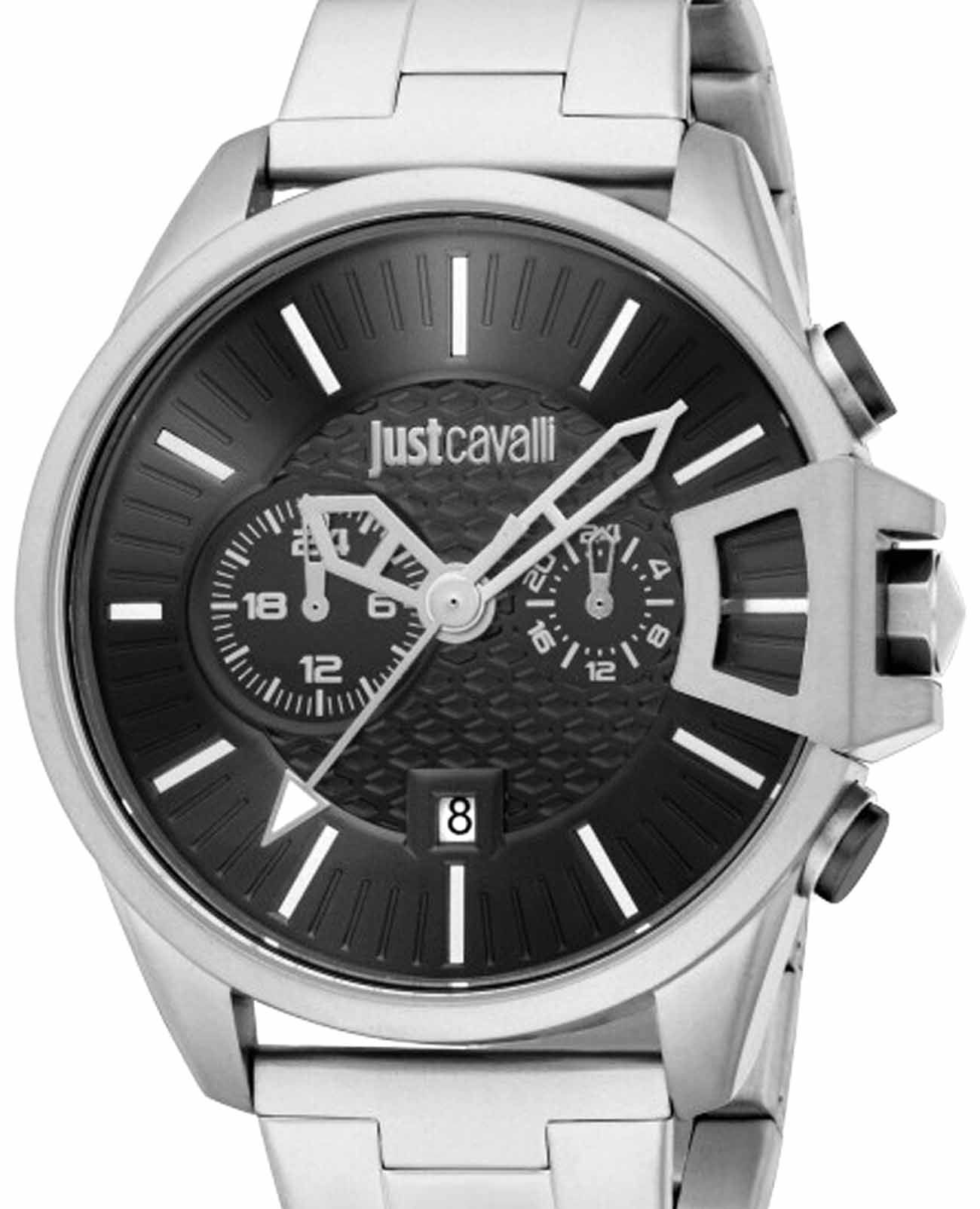 JUST CAVALLI JC1G346M0045 — стильные итальянские часы с функцией второй часовой поясВторой часовой поясФункция, позволяющая отображать время двух часовых поясов одновременно., которые сочетают в себе элегантность и современный функционал. Круглый корпус диаметром 45 мм выполнен из нержавеющей стали, толщина корпуса составляет 12 мм, что придает модели выразительный внешний вид и надежную защиту от внешних воздействий. Часы оснащены кварцевым механизмом, также обладают функцией отображения даты, что делает их удобными для ежедневного использования. Минеральное стеклоМинеральное стеклоМинеральное стекло представляет собой искусственно выращенный минерал кварца. Такое стекло отличается особой устойчивостью к повреждениям и царапинам. Уступает по некоторым качествам сапфировому стеклу. защищает часы от царапин, а водозащита 50 метров идеально подходит для повседневного ношения. Стальной браслет на раскладной застёжкеРаскладная застёжкаТакой тип застёжки используется только на браслетах из металла. Она никогда не раскрывается полностью, происходит разделение на 2 и более частей. Раскладывающая застёжка снизит вероятность потери часов к минимуму. обеспечивает комфортное ношение.