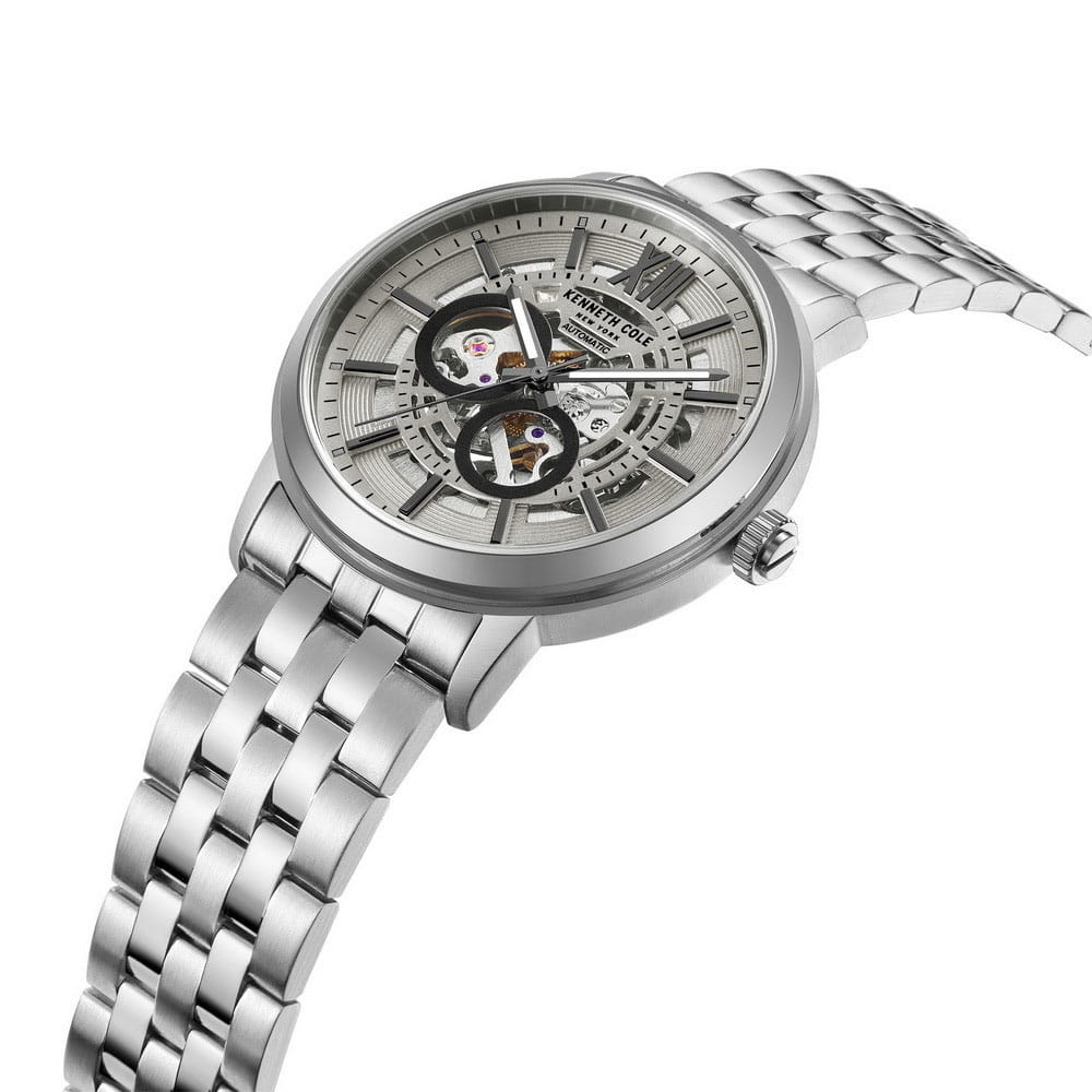 Мужские механические часы-скелетоны с минеральным стекломМинеральное стеклоМинеральное стекло представляет собой искусственно выращенный минерал кварца. Такое стекло отличается особой устойчивостью к повреждениям и царапинам. Уступает по некоторым качествам сапфировому стеклу. Kenneth Cole Automatic KCWGL2217203, механический механизм (автоматический калибр) с высокой точностью. Класс водозащиты: 30 метров, позволит защитить корпус от случайных брызг или капель дождя. Корпус часов изготовлен из стали. Стальной браслет на раскладной застёжкеРаскладная застёжкаТакой тип застёжки используется только на браслетах из металла. Она никогда не раскрывается полностью, происходит разделение на 2 и более частей. Раскладывающая застёжка снизит вероятность потери часов к минимуму.. Стрелки с люминесцентным покрытиемЛюминесцентное покрытиеПозволяет считывать показания времени в темноте. Производители наносят на стрелки, часовые индексы, безель или поверхность циферблата светонакопительный состав, дающий холодное свечение..