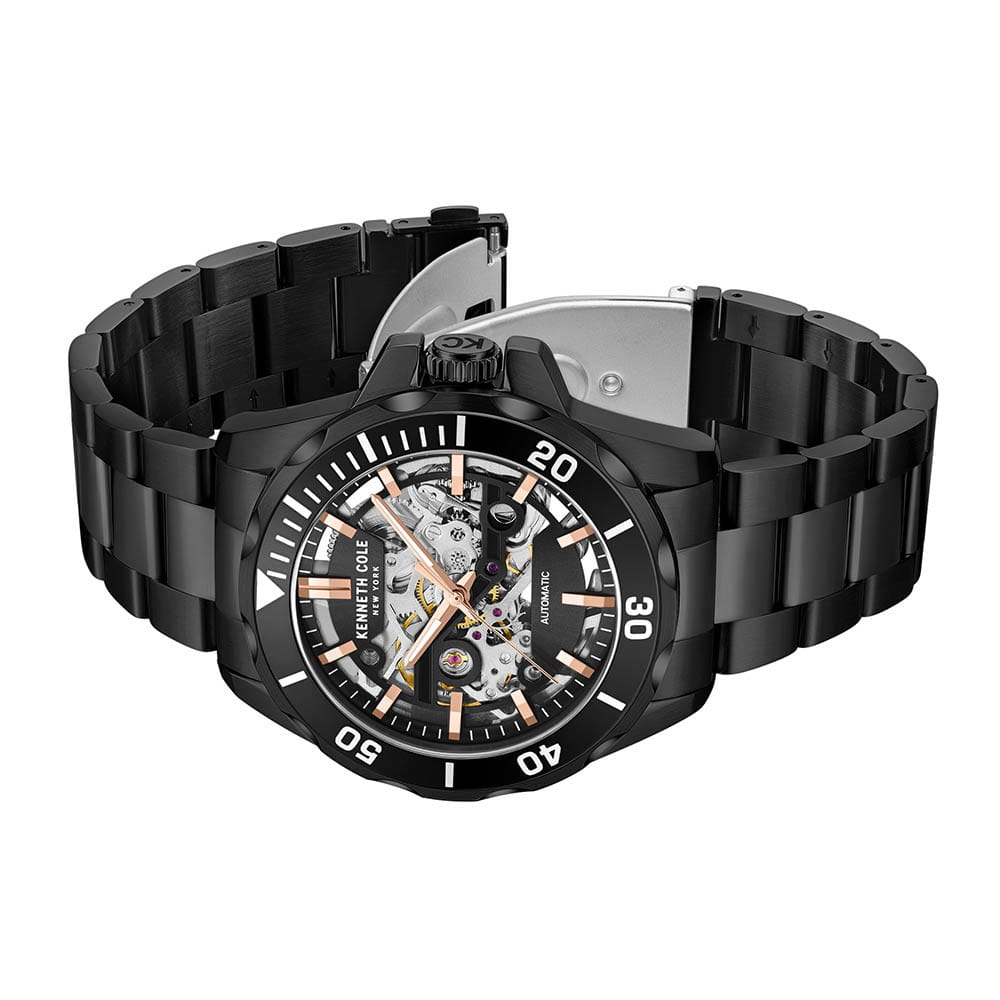 Мужские механические часы с автоподзаводом Kenneth Cole KCWGY0046002 — это стильный и современный аксессуар с выразительным дизайном. Корпус диаметром 43 мм выполнен из стали с IP-покрытиемIP-покрытиеМетод ионного напыления. Демонстрирует повышенную устойчивость к истиранию, окислению и химическим веществам. Под воздействием высокого давления и температуры около 1500°C молекулы металла надёжно соединяются с частицами корпуса часов. чёрного цвета. Циферблат чёрного цвета оснащён люминесцентным покрытиемЛюминесцентное покрытиеПозволяет считывать показания времени в темноте. Производители наносят на стрелки, часовые индексы, безель или поверхность циферблата светонакопительный состав, дающий холодное свечение. и частично скелетонизирован, что позволяет наблюдать за работой механизма. Циферблат защищён минеральным стекломМинеральное стеклоМинеральное стекло представляет собой искусственно выращенный минерал кварца. Такое стекло отличается особой устойчивостью к повреждениям и царапинам. Уступает по некоторым качествам сапфировому стеклу. и оформлен метками в виде арабских цифр и штрихов. Часы оснащены браслетом из нержавеющей стали чёрного цвета с раскладной застёжкойРаскладная застёжкаТакой тип застёжки используется только на браслетах из металла. Она никогда не раскрывается полностью, происходит разделение на 2 и более частей. Раскладывающая застёжка снизит вероятность потери часов к минимуму.. Водонепроницаемость 50 м позволяет использовать часы для плавания и повседневного ношения. Стильно и практично.