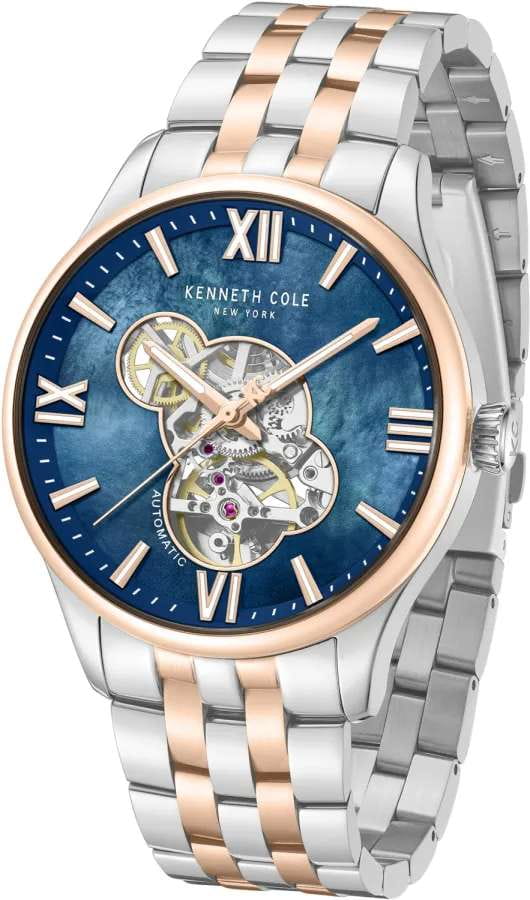 Мужские механические часы с автоподзаводом Kenneth Cole — это выразительный и элегантный аксессуар. Корпус диаметром 43 мм выполнен из нержавеющей стали. БезельБезельВнешний ободок, закрепляющий стекло. В спортивных часах так называется поворотное кольцо с делениями на циферблате, выполняет роль таймера – замеряет отрезки времени на шкале. Неподвижный безель – элемент декора. Однонаправленно вращающийся безель на дайверских часах позволяет фиксировать моменты погружения и выныривания на поверхность. из нержавеющей стали с IP-покрытиемIP-покрытиеМетод ионного напыления. Демонстрирует повышенную устойчивость к истиранию, окислению и химическим веществам. Под воздействием высокого давления и температуры около 1500°C молекулы металла надёжно соединяются с частицами корпуса часов.. Циферблат синего цвета оформлен в стиле скелетон, что позволяет наблюдать за работой механизма. Циферблат защищён минеральным стекломМинеральное стеклоМинеральное стекло представляет собой искусственно выращенный минерал кварца. Такое стекло отличается особой устойчивостью к повреждениям и царапинам. Уступает по некоторым качествам сапфировому стеклу.. Механизм — автоматический с функцией подзавода от движения руки. Часы оснащены стальным браслетом с IP-покрытиемIP-покрытиеМетод ионного напыления. Демонстрирует повышенную устойчивость к истиранию, окислению и химическим веществам. Под воздействием высокого давления и температуры около 1500°C молекулы металла надёжно соединяются с частицами корпуса часов. на раскладной застёжкеРаскладная застёжкаТакой тип застёжки используется только на браслетах из металла. Она никогда не раскрывается полностью, происходит разделение на 2 и более частей. Раскладывающая застёжка снизит вероятность потери часов к минимуму.. Водонепроницаемость 50 м позволяет использовать часы в повседневных условиях. Идеальный выбор для тех, кто ценит стиль, технологии и американское качество.
