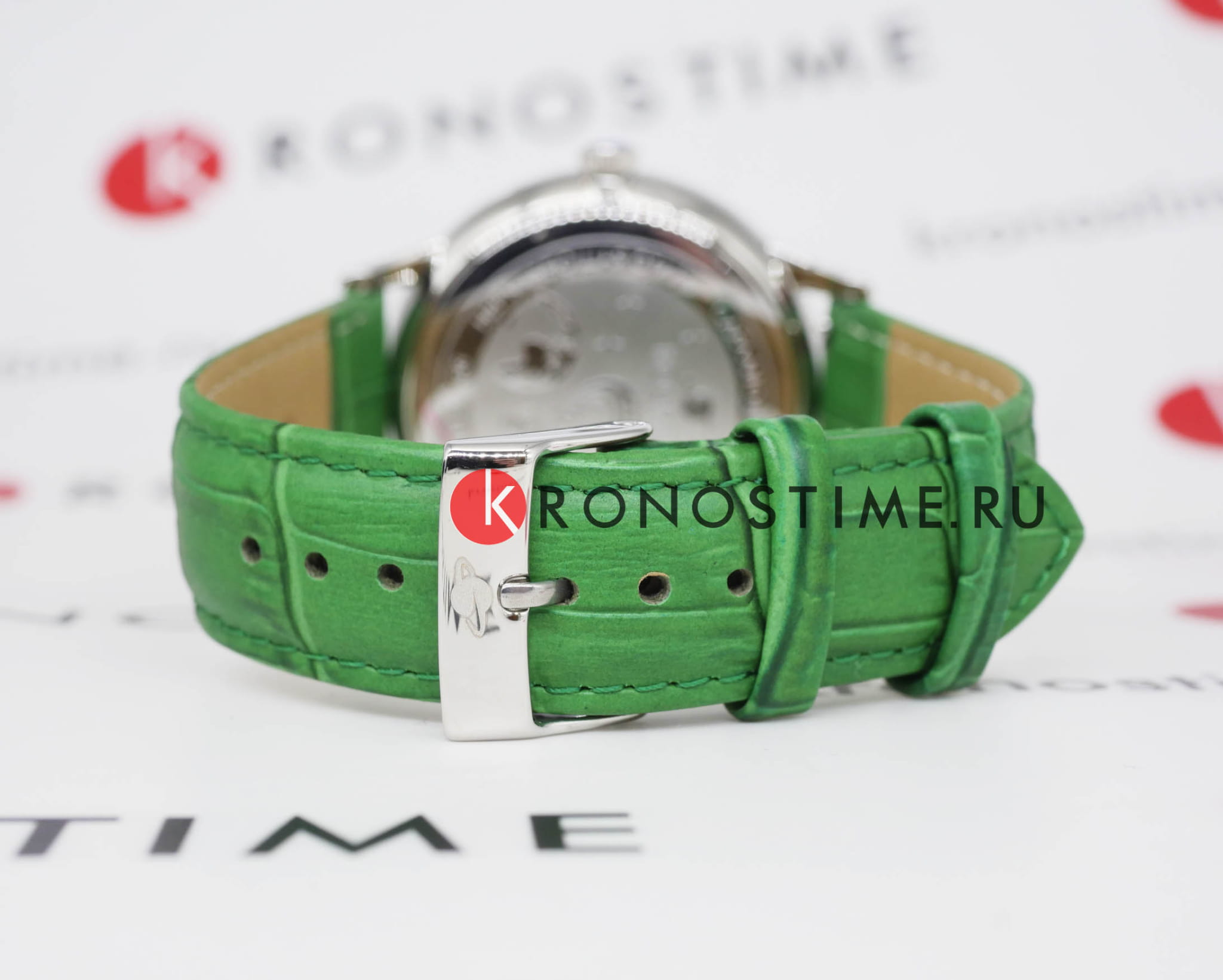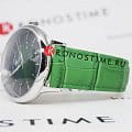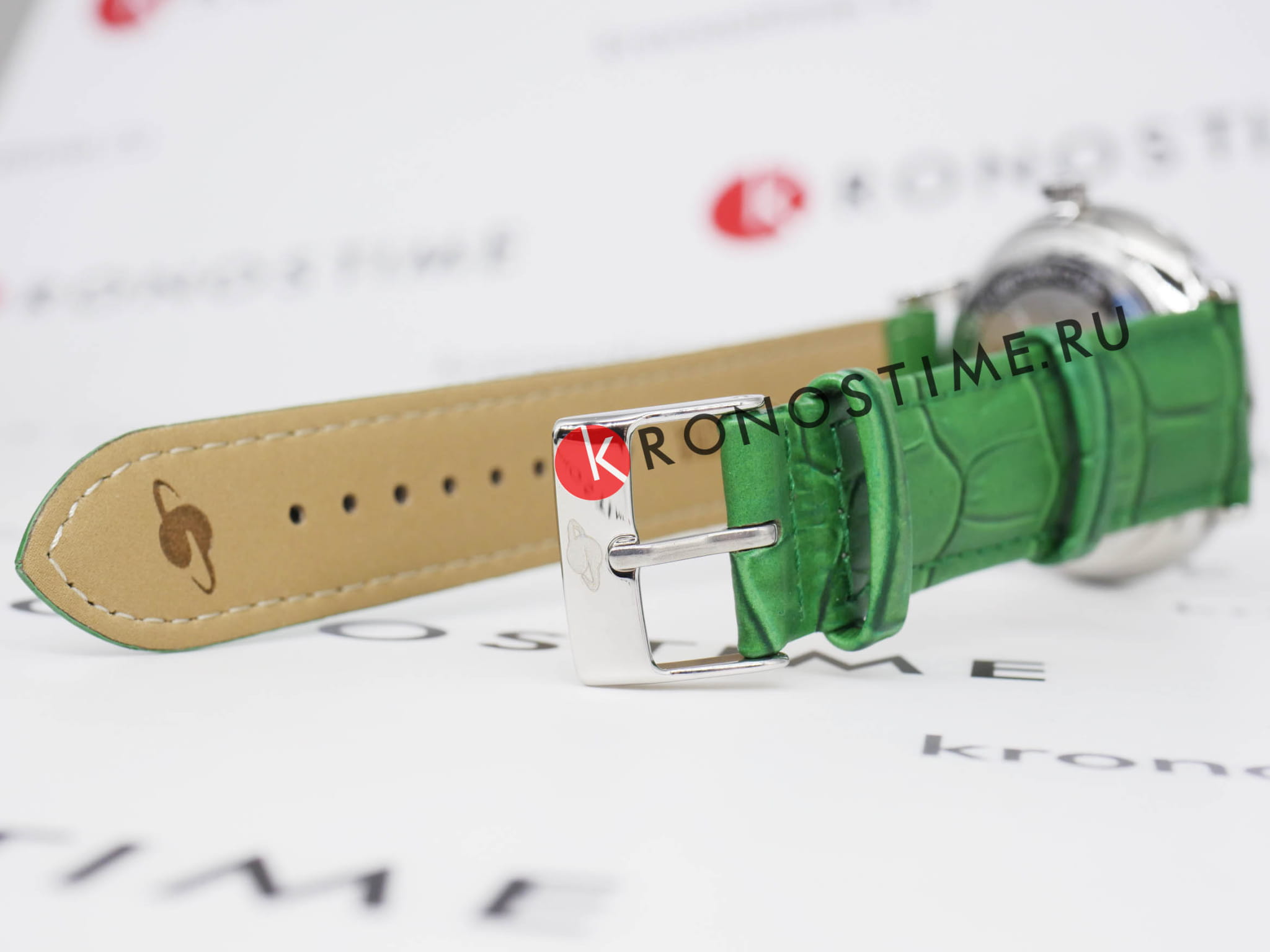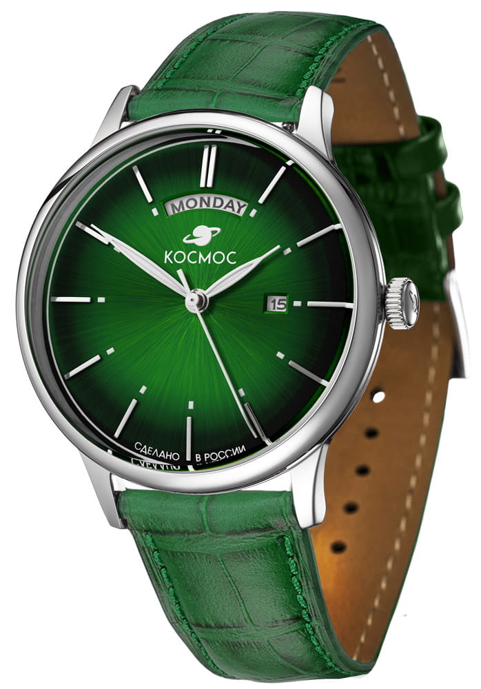 Мужские наручные часы Космос Орион K 011.17.38  — это сочетание традиций часового искусства 60-70-х годов и футуристического дизайна, вдохновленного космическими исследованиями. Они не только служат напоминанием о прошлом, но и побуждают задуматься о будущем, позволяя наслаждаться качеством и смыслом, вложенными в каждую деталь. Полированный корпус часов выполнен в виде силуэта летающей тарелки благодаря выпуклым формам стекла и нижней части корпуса. Стальные ушки, которые напоминают опоры летающей тарелки, завершает общий образ. На задней крышке часов выгравирован фантазийный сюжет – космическая станция будущего. Зеленый циферблат, выполненный в ретро-стиле, имеет выгнутые края, что требует использования сложной технологии производства. Такой дизайн был характерен для часов прошлых эпох. Секундная стрелка, имеющая изогнутую форму, идеально соответствует контуру циферблата. Выпуклый градиентный циферблат с шлифовкой, напоминающей солнечные лучи, украшен вручную изготовленными индексами, которые надежно крепятся на двух штифтах. Часовая и минутная стрелки, а также линия по краю циферблата, напоминающая ореол Земли, имеют люминесцентное покрытиеЛюминесцентное покрытиеПозволяет считывать показания времени в темноте. Производители наносят на стрелки, часовые индексы, безель или поверхность циферблата светонакопительный состав, дающий холодное свечение., которое светится в темноте, создавая впечатляющий визуальный эффект. В верхней части циферблата расположено окошко для отображения дня недели на английском языке, а индикаторы даты и дня недели дополнительно украшены фасочками, что придает им элегантный вид. Форма минерального стеклаМинеральное стеклоМинеральное стекло представляет собой искусственно выращенный минерал кварца. Такое стекло отличается особой устойчивостью к повреждениям и царапинам. Уступает по некоторым качествам сапфировому стеклу. также тщательно продумана, оно изогнуто как снаружи, так и изнутри. Это позволяет избежать искажений изображения на циферблате, в отличие от традиционного стекла с прямой внутренней частью, создающего эффект линзы. Ремешок из натуральной кожи зеленого цвета прекрасно дополняет часы. Также имеется возможность приобрести дополнительные ремни и браслеты миланского плетения, которые можно легко менять благодаря специальным крепежам. Заводная головка, застежка и ремешок украшены фирменным логотипом, подчеркивающим индивидуальность и стиль модели.