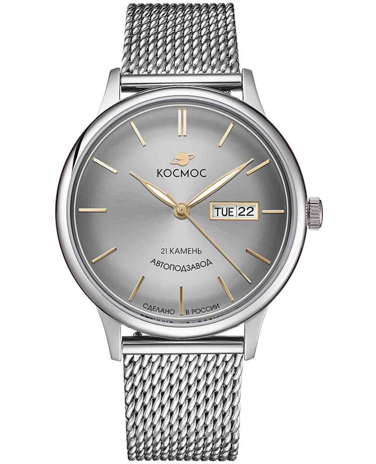 Российские мужские механические часы Космос K 043.10.33 с автоподзаводом оснащены корпусом из нержавеющей стали 316L диаметром 41 мм и защищены минеральным стекломМинеральное стеклоМинеральное стекло представляет собой искусственно выращенный минерал кварца. Такое стекло отличается особой устойчивостью к повреждениям и царапинам. Уступает по некоторым качествам сапфировому стеклу.. Дополнен функциями отображения даты и дня недели. Заводная головка декорирована логотипом бренда в виде стилизованного изображения планеты. Часы имеют водонепроницаемость 50 метров, позволит защитить корпус от случайных брызг или капель дождя. Модель комплектуется браслетом из нержавеющей стали 316L с миланским плетением на раскладном замкеРаскладной замокДанный вариант застежки используется только на часах с металлическим браслетом. Отличительная особенность такого крепления в том, что длина браслета становится универсальной и вы можете самостоятельно отрегулировать нужный вам размер – застежка просто двигается по браслету часов.. Специальные крепежи позволяют легко заменить браслет на часах самостоятельно. Прочный корпус и надежный механизм делают эти часы универсальным аксессуаром для повседневного использования. Уникальный дизайн и высокое качество материалов подчеркивают индивидуальность владельца.
