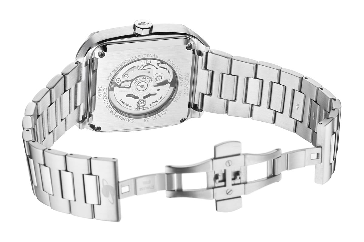 Мужские наручные часы Космос Марсоход K 213.10.36 — это уникальная лимитированная серия, посвященная аппарату, способному передвигаться по поверхности Красной планеты. Марсоход ассоциируется с брутальностью, мастерством и технической сложностью. Наша страна дважды запускала подобные аппараты еще в 70-х годах прошлого века. Дизайн часов серии Марсоход вдохновлен лучшими работами советских мастеров, сочетая современные технологии часового искусства с обаянием стиля ретро. Корпус в форме квадрата с закругленными углами выполнен из нержавеющей стали марки 316L, украшенной зеркальной полировкой и сатинированием. Удобная заводная головка имеет форму гайки, что добавляет модели индустриальный шарм. Задняя крышка прозрачная, закрепленная на четырех винтах, и позволяет увидеть работу механизма TMI с подвижным ротором, на котором гравируется надпись «Сделано в России». Также здесь представлена гравировка с изображением космонавта, придающая часам особую значимость. Водостойкость достигает 10 атм (WR100), что позволяет использовать часы при плавании и других водных видах спорта. На задней крышке указан индивидуальный номер модели в формате от 01/50 до 50/50 (первый выпуск) или от 051/200 до 200/200 (второй выпуск). Объемный циферблат состоит из двух уровней. В центре движутся три стрелки, часовая и минутная из которых имеют люминесцентное покрытиеЛюминесцентное покрытиеПозволяет считывать показания времени в темноте. Производители наносят на стрелки, часовые индексы, безель или поверхность циферблата светонакопительный состав, дающий холодное свечение., позволяющее определять время даже в темноте. Индексы накладные, как и стальная рамка, выделяющая сдвоенное окошко даты и дня недели, где день недели отображается на двух языках — русском и английском. Циферблат защищен прочным сапфировым стеклом с антибликовым покрытиемСапфировое стеклоПрочный и надёжный материал из кристалла сапфира синтетического происхождения, характеризующийся особой твёрдостью и устойчивостью к царапинам и повреждениям., обеспечивающим отличную читаемость показаний в любых условиях. Браслет изготовлен из литых стальных звеньев нержавеющей стали 316L и оснащен удобной застёжкой «бабочка» с кнопкамиЗастёжка "бабочка"Такой вид застёжки дополняется предохранителями, помогающими избежать случайного раскрытия браслета. Обладают изящным исполнением. , которая сводит к минимуму вероятность потери. Заводная головка, застежка и браслет украшены фирменным логотипом бренда. Коллекция Марсоход — идеальный выбор для ценителей истории космических достижений и современных технологий.