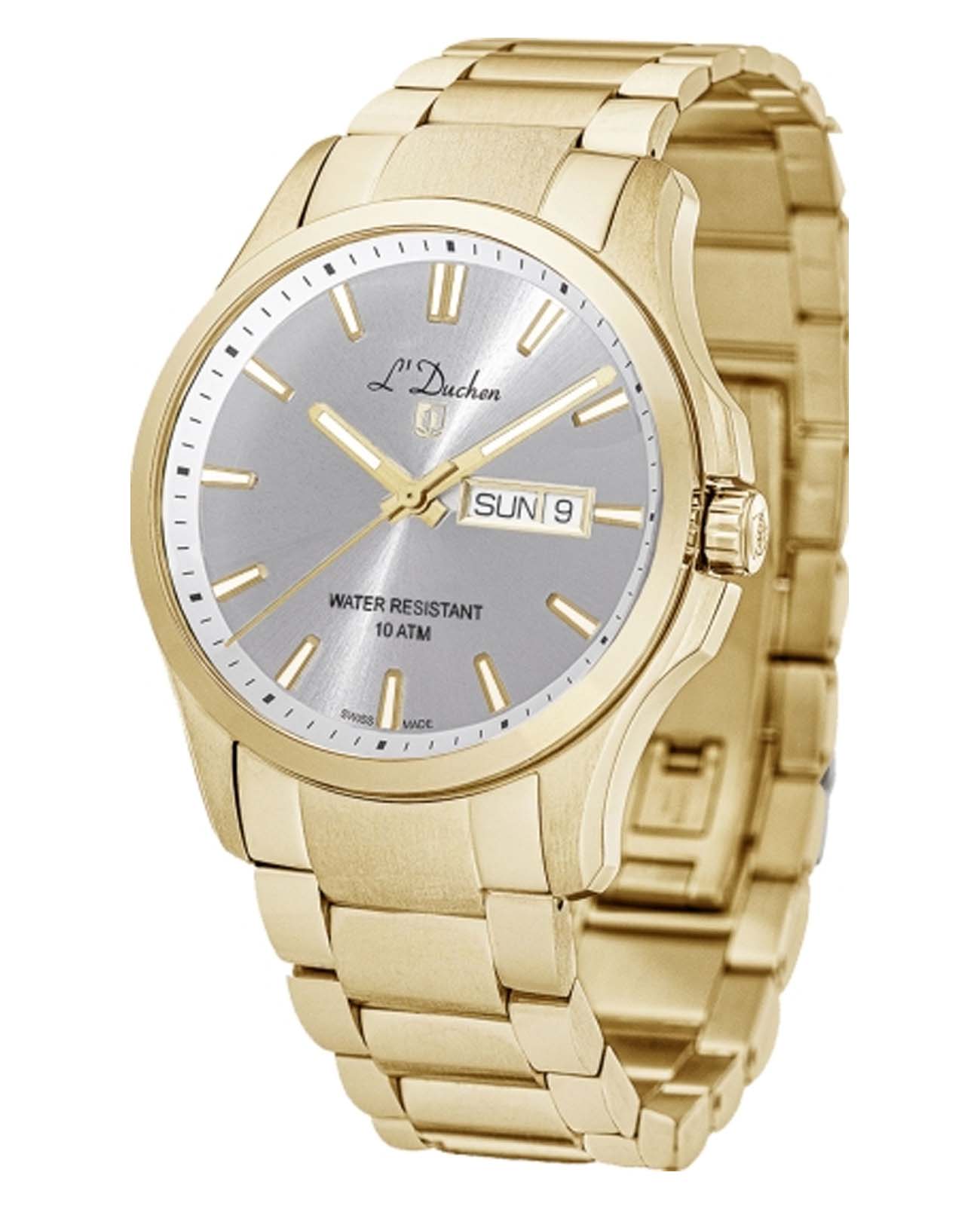 Мужские швейцарские часы L'Duchen Dynamique D 261.20.33, кварцевый механизм с высокой точностью. Сапфировое стеклоСапфировое стеклоПрочный и надёжный материал из кристалла сапфира синтетического происхождения, характеризующийся особой твёрдостью и устойчивостью к царапинам и повреждениям. устойчивое к появлению царапин, обладающее высокой прозрачностью. Корпус часов выполнен из нержавеющей стали с PVD-покрытиемPVDУльтратонкое покрытие наносится в технике вакуумного напыления, сочетает в себе нитрид титана особой прочности со слоем золота или оксида хрома. Несёт в себе декоративную или защитную функцию.. Стрелки с люминесцентным покрытиемЛюминесцентное покрытиеПозволяет считывать показания времени в темноте. Производители наносят на стрелки, часовые индексы, безель или поверхность циферблата светонакопительный состав, дающий холодное свечение.. Класс водозащиты: 100 метров, позволит плавать, нырять и заниматься другими водными видами спорта. Стальной браслет с PVD-покрытиемPVDУльтратонкое покрытие наносится в технике вакуумного напыления, сочетает в себе нитрид титана особой прочности со слоем золота или оксида хрома. Несёт в себе декоративную или защитную функцию. на застёжке «бабочка» с кнопкамиЗастёжка "бабочка"Такой вид застёжки дополняется предохранителями, помогающими избежать случайного раскрытия браслета. Обладают изящным исполнением. .