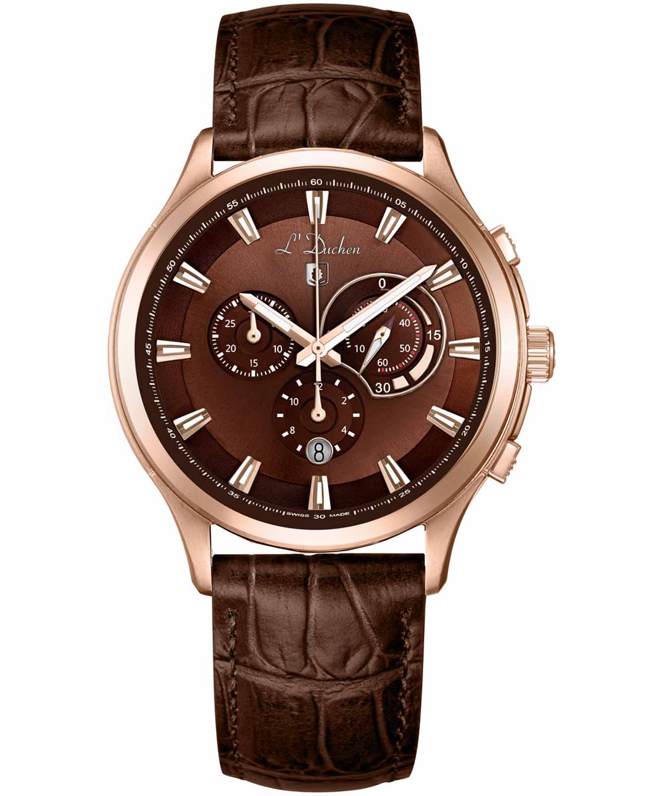 Мужские швейцарские часы- хронографХронографФункция позволяет измерять отрезки времени с особой точностью: часы, минуты, секунды. Верным признаком хронографа является наличие на циферблате 3 дополнительных окошек-счётчиков. L'Duchen Pilotage D 742.41.43, кварцевый механизм с высокой точностью. Сапфировое стеклоСапфировое стеклоПрочный и надёжный материал из кристалла сапфира синтетического происхождения, характеризующийся особой твёрдостью и устойчивостью к царапинам и повреждениям. устойчивое к появлению царапин, обладающее высокой прозрачностью. Корпус часов выполнен из нержавеющей стали с PVD-покрытиемPVDУльтратонкое покрытие наносится в технике вакуумного напыления, сочетает в себе нитрид титана особой прочности со слоем золота или оксида хрома. Несёт в себе декоративную или защитную функцию.. Стрелки с люминесцентным покрытиемЛюминесцентное покрытиеПозволяет считывать показания времени в темноте. Производители наносят на стрелки, часовые индексы, безель или поверхность циферблата светонакопительный состав, дающий холодное свечение.. Класс водозащиты: 100 метров, позволит плавать, нырять и заниматься другими водными видами спорта. Кожаный ремешок на застёжке «бабочка» с кнопкамиЗастёжка "бабочка"Такой вид застёжки дополняется предохранителями, помогающими избежать случайного раскрытия браслета. Обладают изящным исполнением. .