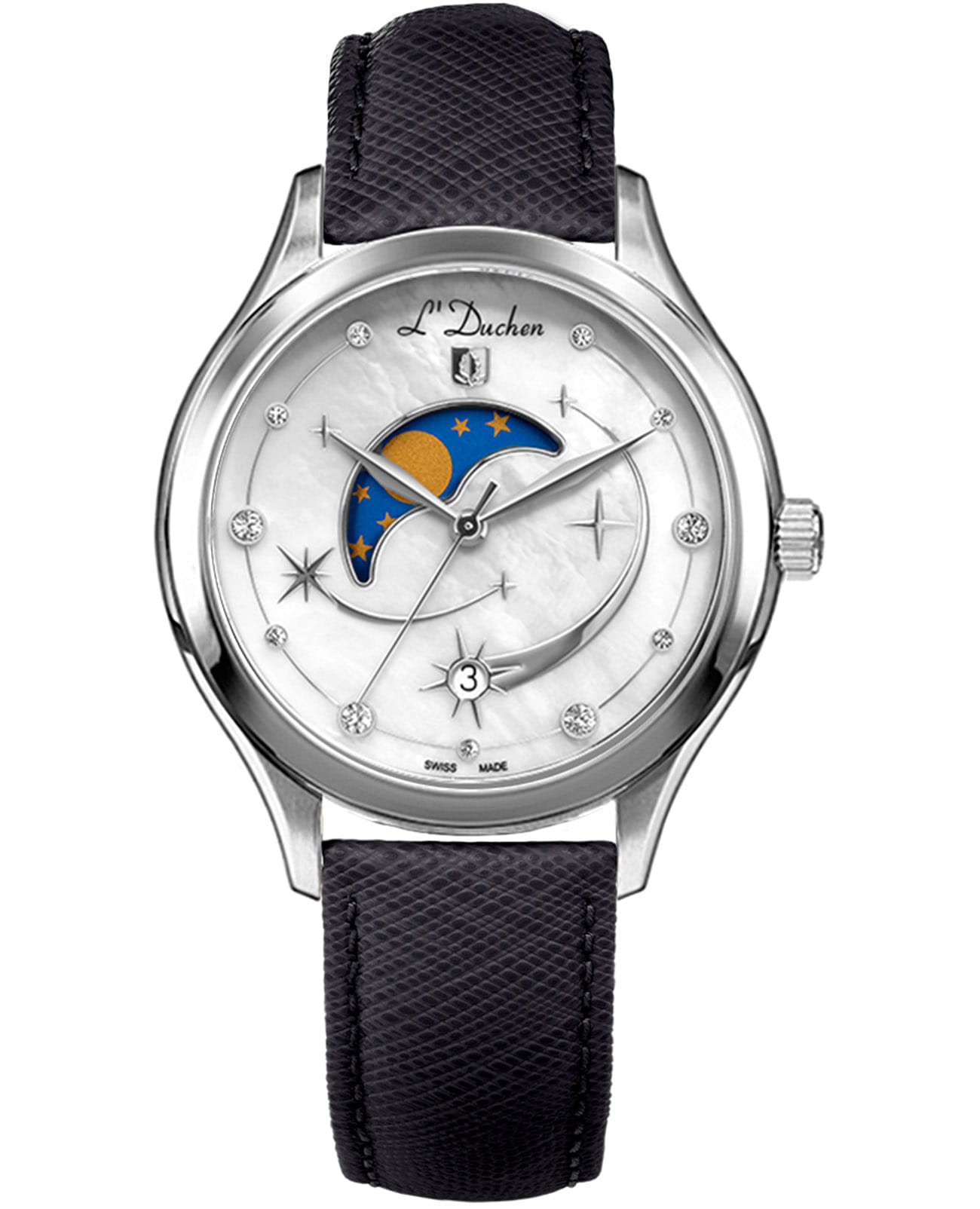 Женские кварцевые часы L'Duchen из коллекции Perseides — это волшебный аксессуар, вдохновлённый космическим зрелищем метеорного потока. Корпус диаметром 34 мм выполнен из нержавеющей стали 316L с эффектным чередованием полированных и матовых поверхностей. Циферблат белого цвета изготовлен из натурального перламутра, природная текстура которого создаёт уникальный фон. Центральная композиция украшена накладными элементами в виде падающих звёзд — символа метеорного потока Персеиды, в один из которых органично вписано окошко даты в положении 6 часов. Указатель фазы луны элегантно выделен металлической рамкой. Циферблат дополнительно сияет благодаря фианитам разного размера. Циферблат защищён сапфировым стекломСапфировое стеклоПрочный и надёжный материал из кристалла сапфира синтетического происхождения, характеризующийся особой твёрдостью и устойчивостью к царапинам и повреждениям.. Часы оснащены ремешком из натуральной кожи чёрного цвета с сафьяновым тиснением и застёжкой «бабочка» с кнопкамиЗастёжка "бабочка"Такой вид застёжки дополняется предохранителями, помогающими избежать случайного раскрытия браслета. Обладают изящным исполнением. , украшенной логотипом бренда — дубовым листом, символом мудрости и долговечности. Заводная головка и задняя крышка также декорированы фирменным тиснением. Водонепроницаемость 50 м позволяет использовать часы в повседневных условиях.