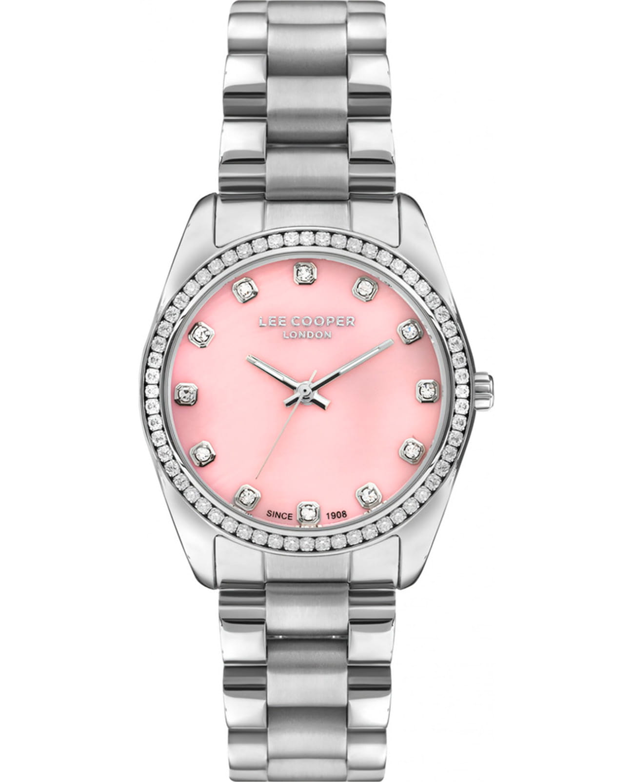 Женские наручные часы Lee Cooper LC07478.380 — это элегантная модель с утончённым дизайном. Корпус диаметром 34 мм выполнен из суперметалла, что придаёт часам изысканный вид. Розовый циферблат украшен изящными стрелками и вставками из циркония в виде меток, обеспечивая удобное считывание времени. Циферблат защищён минеральным стекломМинеральное стеклоМинеральное стекло представляет собой искусственно выращенный минерал кварца. Такое стекло отличается особой устойчивостью к повреждениям и царапинам. Уступает по некоторым качествам сапфировому стеклу., устойчивым к царапинам. Часы работают на кварцевом механизме, обеспечивая точность хода. Браслет из нержавеющей стали с раскладной застёжкойРаскладная застёжкаТакой тип застёжки используется только на браслетах из металла. Она никогда не раскрывается полностью, происходит разделение на 2 и более частей. Раскладывающая застёжка снизит вероятность потери часов к минимуму. гарантирует комфортное ношение и надёжную фиксацию на запястье. Водозащита 30 метров защищает часы от случайных брызг и дождя, делая их подходящими для повседневного использования. БезельБезельВнешний ободок, закрепляющий стекло. В спортивных часах так называется поворотное кольцо с делениями на циферблате, выполняет роль таймера – замеряет отрезки времени на шкале. Неподвижный безель – элемент декора. Однонаправленно вращающийся безель на дайверских часах позволяет фиксировать моменты погружения и выныривания на поверхность. инкрустирован кристаллами. Стрелки покрыты люминесцентным покрытиемЛюминесцентное покрытиеПозволяет считывать показания времени в темноте. Производители наносят на стрелки, часовые индексы, безель или поверхность циферблата светонакопительный состав, дающий холодное свечение., обеспечивая удобное считывание показаний в условиях недостаточного освещения.