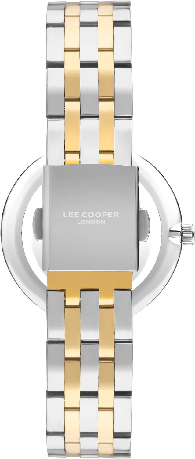 Женские часы Lee Cooper LC07502.230 — это стильное сочетание элегантности и современного дизайна. Круглый корпус диаметром 34 мм выполнен из суперметалла в серебристом цвете, а неподвижный безельБезельВнешний ободок, закрепляющий стекло. В спортивных часах так называется поворотное кольцо с делениями на циферблате, выполняет роль таймера – замеряет отрезки времени на шкале. Неподвижный безель – элемент декора. Однонаправленно вращающийся безель на дайверских часах позволяет фиксировать моменты погружения и выныривания на поверхность. с IP-покрытиемIP-покрытиеМетод ионного напыления. Демонстрирует повышенную устойчивость к истиранию, окислению и химическим веществам. Под воздействием высокого давления и температуры около 1500°C молекулы металла надёжно соединяются с частицами корпуса часов. золотого цвета, придает модели особый блеск. Серый циферблат защищен минеральным стекломМинеральное стеклоМинеральное стекло представляет собой искусственно выращенный минерал кварца. Такое стекло отличается особой устойчивостью к повреждениям и царапинам. Уступает по некоторым качествам сапфировому стеклу., обеспечивающим устойчивость к царапинам. Метки в виде штрихов. Часы оснащены надежным кварцевым механизмом, а металлический браслет с частичным IP-покрытиемIP-покрытиеМетод ионного напыления. Демонстрирует повышенную устойчивость к истиранию, окислению и химическим веществам. Под воздействием высокого давления и температуры около 1500°C молекулы металла надёжно соединяются с частицами корпуса часов. на раскладной застёжкеРаскладная застёжкаТакой тип застёжки используется только на браслетах из металла. Она никогда не раскрывается полностью, происходит разделение на 2 и более частей. Раскладывающая застёжка снизит вероятность потери часов к минимуму. гарантирует комфортную посадку на запястье. Стрелки с люминесцентным покрытиемЛюминесцентное покрытиеПозволяет считывать показания времени в темноте. Производители наносят на стрелки, часовые индексы, безель или поверхность циферблата светонакопительный состав, дающий холодное свечение. позволяют легко считывать время даже в условиях недостаточного освещения. Водозащита 30 метров защищает модель от случайных брызг и дождя. Lee Cooper  — отличный выбор для тех, кто ценит утонченность и качество.