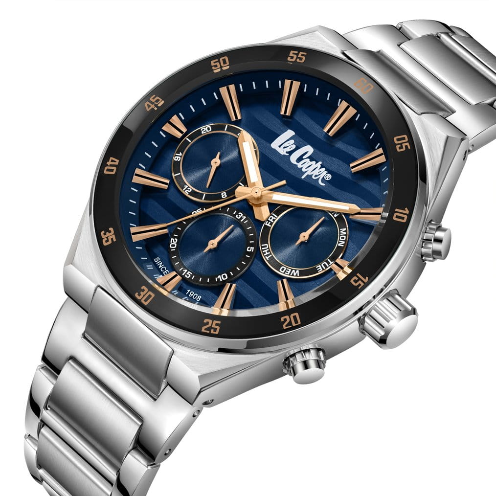 Мужские наручные часы Lee Cooper LC08175.390 оснащены кварцевым механизмом, обеспечивающий высокую точность хода и надежность. Элегантный корпус часов выполнен из суперметалла серебристого цвета, что делает их устойчивыми к внешним воздействиям и придает благородный вид. Циферблат украшен классическими стрелками с люминесцентным покрытиемЛюминесцентное покрытиеПозволяет считывать показания времени в темноте. Производители наносят на стрелки, часовые индексы, безель или поверхность циферблата светонакопительный состав, дающий холодное свечение., гармонично дополняющим общий дизайн модели. Для защиты циферблата используется минеральное стеклоМинеральное стеклоМинеральное стекло представляет собой искусственно выращенный минерал кварца. Такое стекло отличается особой устойчивостью к повреждениям и царапинам. Уступает по некоторым качествам сапфировому стеклу., устойчивое к царапинам и механическим повреждениям. Неподвижный безельБезельВнешний ободок, закрепляющий стекло. В спортивных часах так называется поворотное кольцо с делениями на циферблате, выполняет роль таймера – замеряет отрезки времени на шкале. Неподвижный безель – элемент декора. Однонаправленно вращающийся безель на дайверских часах позволяет фиксировать моменты погружения и выныривания на поверхность. с IP-покрытиемIP-покрытиеМетод ионного напыления. Демонстрирует повышенную устойчивость к истиранию, окислению и химическим веществам. Под воздействием высокого давления и температуры около 1500°C молекулы металла надёжно соединяются с частицами корпуса часов. черного цвета. Корпус имеет круглую форму диаметром 43 мм, что делает часы заметными и подходящими. Браслет из стали оснащен раскладной застёжкойРаскладная застёжкаТакой тип застёжки используется только на браслетах из металла. Она никогда не раскрывается полностью, происходит разделение на 2 и более частей. Раскладывающая застёжка снизит вероятность потери часов к минимуму., обеспечивающим комфортное и безопасное ношение. Вынесенный циферблат с 24-х часовым указателем времени, индикацией даты и дня недели. Часы обладают водонепроницаемостью до 50 метров (5 АТМ), что позволяет использовать их в повседневной жизни, включая контакт с водой при мытье рук или дожде. Эти часы станут идеальным выбором для мужчин, ценящих стиль, качество и функциональность.