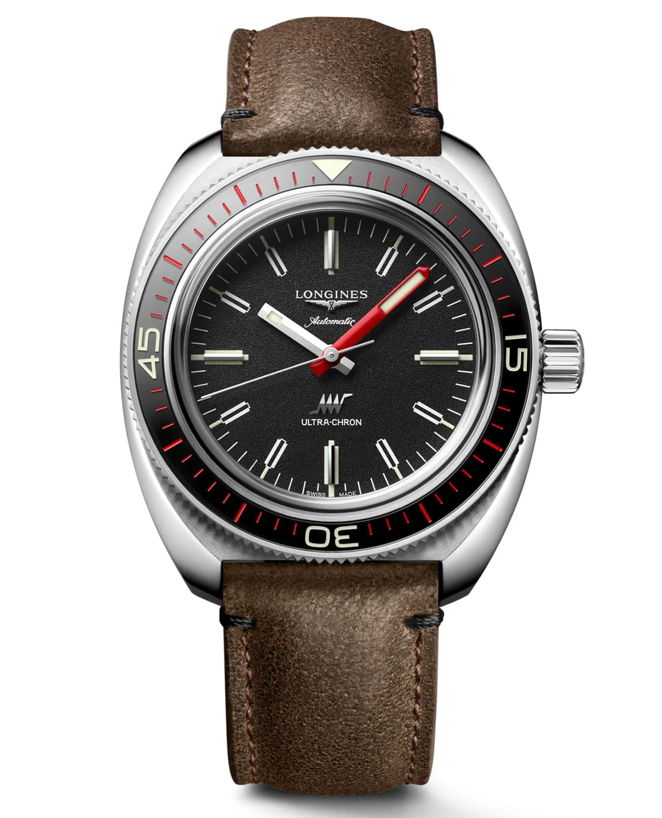 Мужские швейцарские механические часы Longines Ultra‑Chron L2.836.4.52.2. Сапфировое стеклоСапфировое стеклоПрочный и надёжный материал из кристалла сапфира синтетического происхождения, характеризующийся особой твёрдостью и устойчивостью к царапинам и повреждениям. с антибликовым покрытием, устойчивое к мелким механическим повреждениям. БезелемБезельВнешний ободок, закрепляющий стекло. В спортивных часах так называется поворотное кольцо с делениями на циферблате, выполняет роль таймера – замеряет отрезки времени на шкале. Неподвижный безель – элемент декора. Однонаправленно вращающийся безель на дайверских часах позволяет фиксировать моменты погружения и выныривания на поверхность. с керамической вставкой. Стрелки и метки с люминесцентнымЛюминесцентное покрытиеПозволяет считывать показания времени в темноте. Производители наносят на стрелки, часовые индексы, безель или поверхность циферблата светонакопительный состав, дающий холодное свечение. покрытием. Запас хода до 52 часов. Класс водозащиты: 300 метров, позволит плавать, нырять и заниматься другими водными видами спорта. Кожаный ремешок на стандартной застежке.