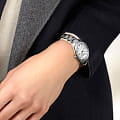Изящная модель с белым перламутровым циферблатом инкрустирована 11 бриллиантами в 0,055 карата, на безелеБезельВнешний ободок, закрепляющий стекло. В спортивных часах так называется поворотное кольцо с делениями на циферблате, выполняет роль таймера – замеряет отрезки времени на шкале. Неподвижный безель – элемент декора. Однонаправленно вращающийся безель на дайверских часах позволяет фиксировать моменты погружения и выныривания на поверхность. – 34 бриллианта в 0,312 карата. Швейцарский кварцевый калибр L152 обеспечивает высокую точность хода. Сапфировое стекло имеет многослойную антибликовую обработкуАнтибликовое покрытиеСлой оксида металла в 0,13-0,3 микрон, благодаря которому стекло часов не бликует и не отражает свет. Антибликовое покрытие уменьшает отражение света в 10 раз, обеспечивая отличную читаемость показателей циферблата.. Наручные часы оснащены календарём, индикатором EOLEOLПредставляет собой систему, уведомляющую владельца часов о необходимости замены элемента питания. За 2 недели до полного разряда батарейки секундная стрелка перестаёт ходить чётко и начинает перепрыгивать на 3-4 деления..