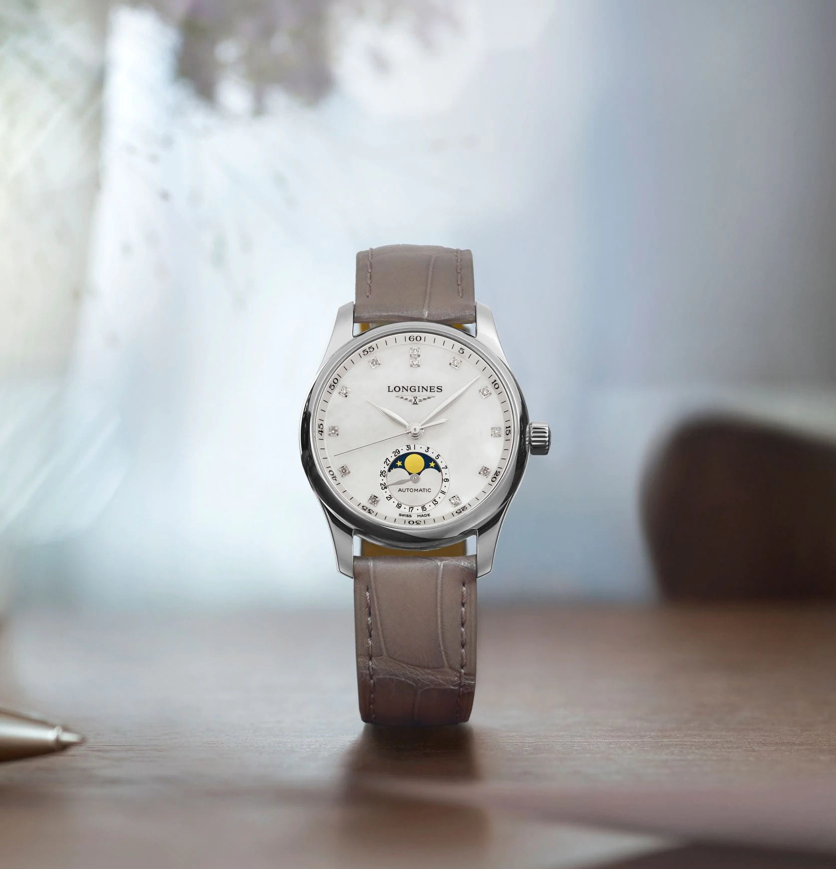 Женские швейцарские механические часы с автоподзаводом Longines Master Collection L2.409.4.87.4. Сапфировое стеклоСапфировое стеклоПрочный и надёжный материал из кристалла сапфира синтетического происхождения, характеризующийся особой твёрдостью и устойчивостью к царапинам и повреждениям. устойчивое к появлению царапин, обладающее высокой прозрачностью. Корпус часов изготовлен из нержавеющей стали. Циферблат с 12 бриллиантами группы Top Wesselton VS-SI общим весом 0.055 карата. Автоматический механизм с частотой баланса 25 200 полуколебаний в час и запасом хода, которого хватает примерно на 72 часа работы. Часы, минуты, секунды, маленький стрелочный указатель фаз Луны и даты в положении 6 часов. Прозрачная задняя крышка. Класс водозащиты: 30 метров, позволит защитить корпус от случайных брызг или капель дождя. Ремешок из кожи аллигатора на застёжке «бабочка» с кнопкамиЗастёжка "бабочка"Такой вид застёжки дополняется предохранителями, помогающими избежать случайного раскрытия браслета. Обладают изящным исполнением. .