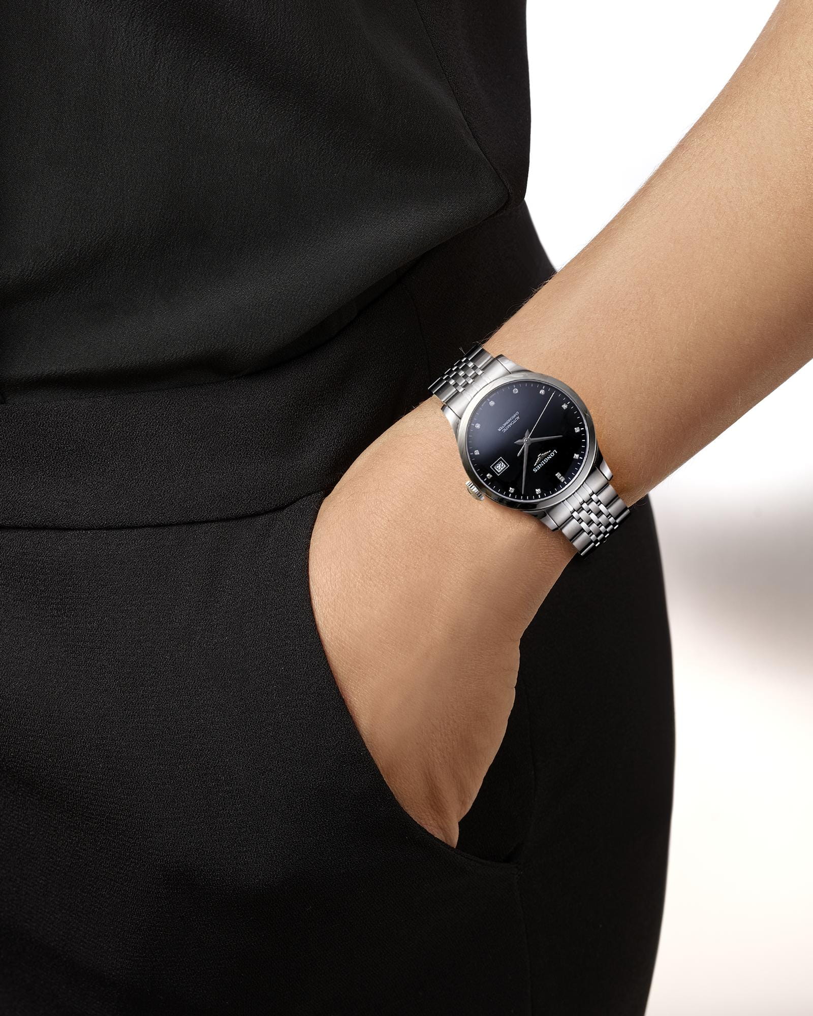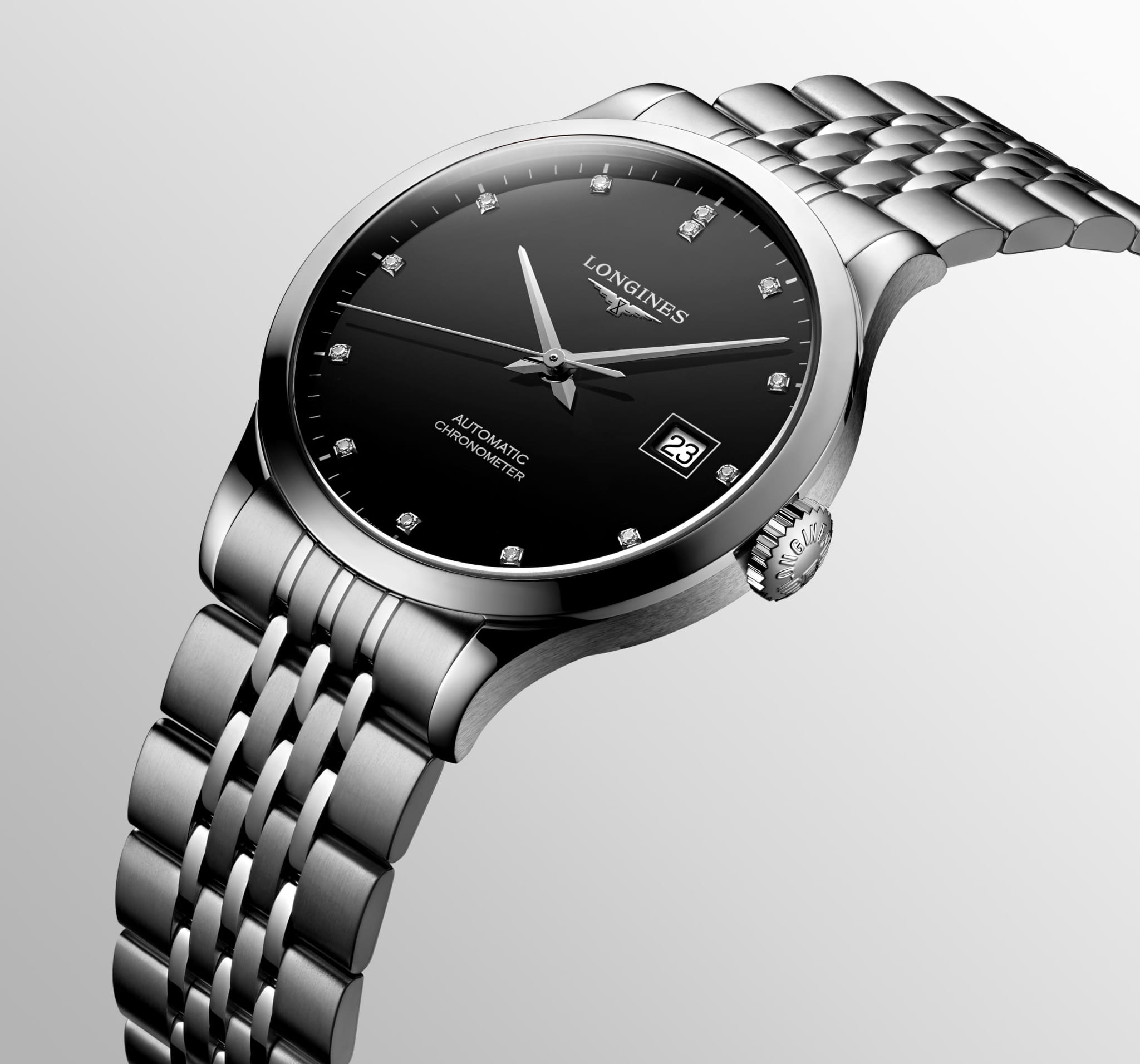 Женские швейцарские механические часы с автоподзаводом Longines Record L2.820.4.57.6. Сапфировое стеклоСапфировое стеклоПрочный и надёжный материал из кристалла сапфира синтетического происхождения, характеризующийся особой твёрдостью и устойчивостью к царапинам и повреждениям. устойчивое к появлению царапин, обладающее высокой прозрачностью. Циферблат выполнен с метками в виде 13 бриллиантов группы Top Wesselton VS-SI общим весом 0.059 карата. Корпус часов из нержавеющей стали. Окошко даты в положении 3 часов. Прозрачная задняя крышка. Класс водозащиты: 30 метров, позволит защитить корпус от случайных брызг или капель дождя. Стальной браслет на застёжке «бабочка» с кнопкамиЗастёжка "бабочка"Такой вид застёжки дополняется предохранителями, помогающими избежать случайного раскрытия браслета. Обладают изящным исполнением. .