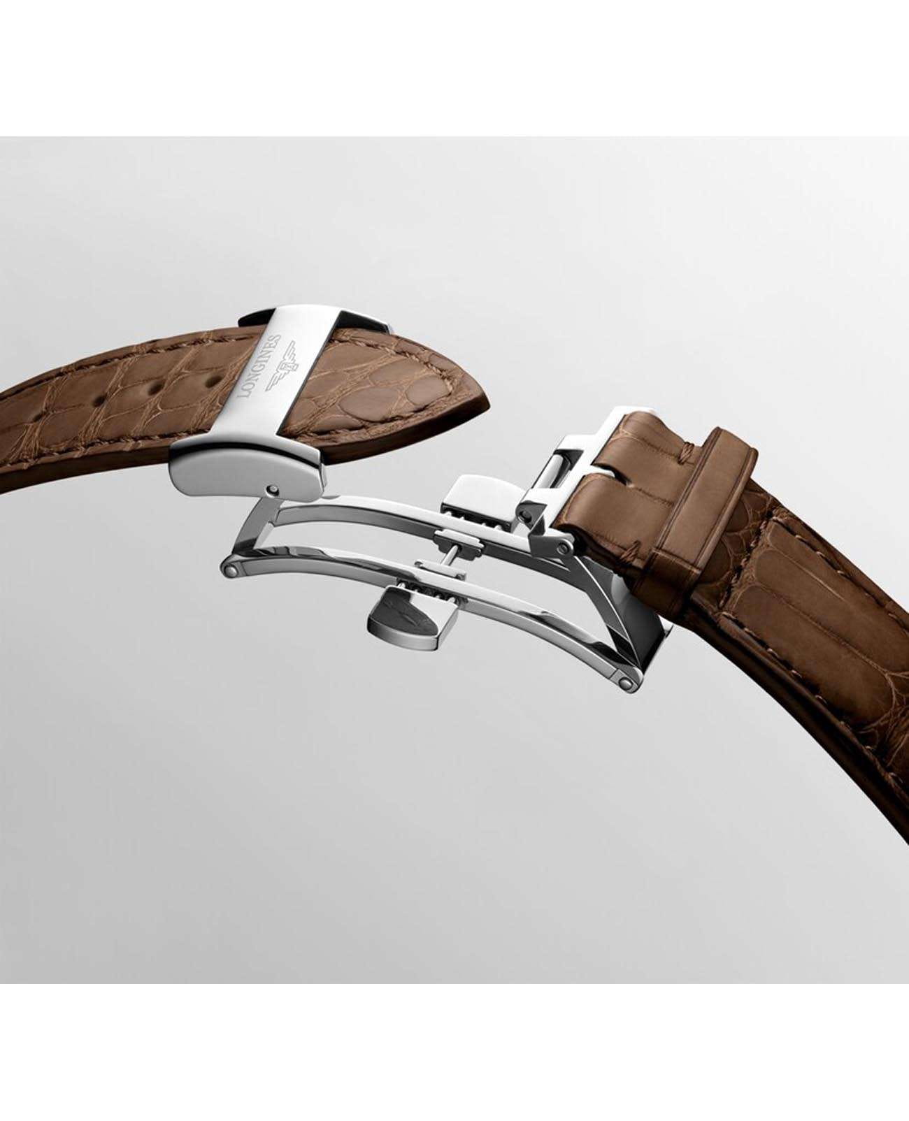 Мужские швейцарские механические часы с Longines Master Collection L2.893.4.59.2. Сапфировое стеклоСапфировое стеклоПрочный и надёжный материал из кристалла сапфира синтетического происхождения, характеризующийся особой твёрдостью и устойчивостью к царапинам и повреждениям. устойчивое к появлению царапин, обладающее высокой прозрачностью. Корпус часов изготовлен из нержавеющей стали. Автоматический механизм с частотой баланса 25 200 полуколебаний в час и запасом хода, которого хватает примерно на 72 часа работы. Окошко даты в положении 3 часа. Класс водозащиты: 30 метров, позволит защитить корпус от случайных брызг или капель дождя. Ремешок из кожи аллигатора на застёжке «бабочка» с кнопкамиЗастёжка "бабочка"Такой вид застёжки дополняется предохранителями, помогающими избежать случайного раскрытия браслета. Обладают изящным исполнением. .