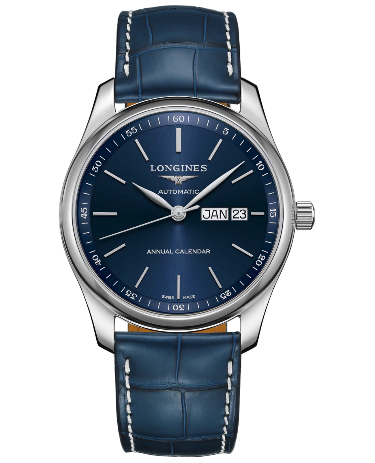 Циферблат с узором «sunray» отражает элегантный стиль. Внутри стального корпуса находится швейцарский автоматический механизм L897. Калибр отличается 64-часовым запасом хода и обеспечивает высокую точность показателей времени. Синий ремешок изготовлен из натуральной кожи аллигатора. Сапфировое стекло устойчиво к появлению царапин. Годовой календарь включает указатели месяца и дня недели.