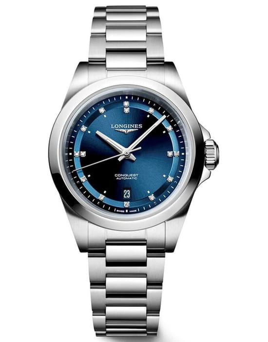 Longines Conquest L3.320.4.97.6 — изысканные женские часы, сочетающие современную элегантность с выразительными ювелирными акцентами. Корпус диаметром 30 мм выполнен из нержавеющей стали и обладает утончённым силуэтом, подчёркнутым бриллиантовым безелем — 48 камней Top Wesselton IF–VVS общей массой около 0,326 карата придают модели благородное сияние.