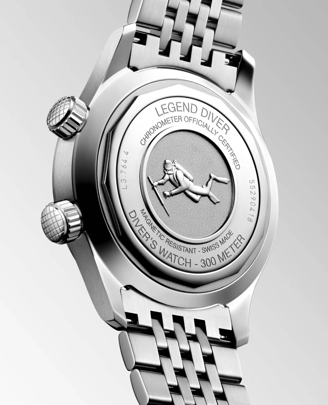 Швейцарские мужские механические часы Longines Legend Diver L3.764.4.99.6 – спортивный аксессуар в дайверском стиле. Циферблат отличается улучшенной читабельностью показателей благодаря крупной индикации времени, стрелками и метками с люминесцентной подсветкойЛюминесцентное покрытиеПозволяет считывать показания времени в темноте. Производители наносят на стрелки, часовые индексы, безель или поверхность циферблата светонакопительный состав, дающий холодное свечение. Super-LumiNova, антибликовому покрытиюАнтибликовое покрытиеСлой оксида металла в 0,13-0,3 микрон, благодаря которому стекло часов не бликует и не отражает свет. Антибликовое покрытие уменьшает отражение света в 10 раз, обеспечивая отличную читаемость показателей циферблата. сапфирового стеклаСапфировое стеклоПрочный и надёжный материал из кристалла сапфира синтетического происхождения, характеризующийся особой твёрдостью и устойчивостью к царапинам и повреждениям., устойчивого к мелким механическим повреждениям. Швейцарский автоматический механизм L888 имеет запас хода на 72 часа. Водозащита 300 метров, позволит плавать, нырять и заниматься другими водными видами спорта. Стальной браслет на раскладной застёжкеРаскладная застёжкаТакой тип застёжки используется только на браслетах из металла. Она никогда не раскрывается полностью, происходит разделение на 2 и более частей. Раскладывающая застёжка снизит вероятность потери часов к минимуму..