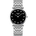 Часы Longines La Grande Classique de Longines L4.512.4.58.6 представляют собой воплощение классической элегантности и утончённости, присущих бренду Longines. Корпус диаметром 29 мм выполнен из нержавеющей стали с водозащитой до 3 бар (30 метров). Чёрный лакированный циферблат украшен 12 бриллиантовыми часовыми метками общим весом 0,081 карата и серебристыми полированными стрелками. Циферблат защищён сапфировым стекломСапфировое стеклоПрочный и надёжный материал из кристалла сапфира синтетического происхождения, характеризующийся особой твёрдостью и устойчивостью к царапинам и повреждениям.. Модель оснащена кварцевым механизмом Longines L420, обеспечивающим точное отображение времени. Браслет из нержавеющей стали с застёжкой бабочкойЗастёжка "бабочка"Такой вид застёжки дополняется предохранителями, помогающими избежать случайного раскрытия браслета. Обладают изящным исполнением. подчёркивает утончённый стиль модели. Эти часы идеально подходят для тех, кто ценит классическую элегантность и надёжность.