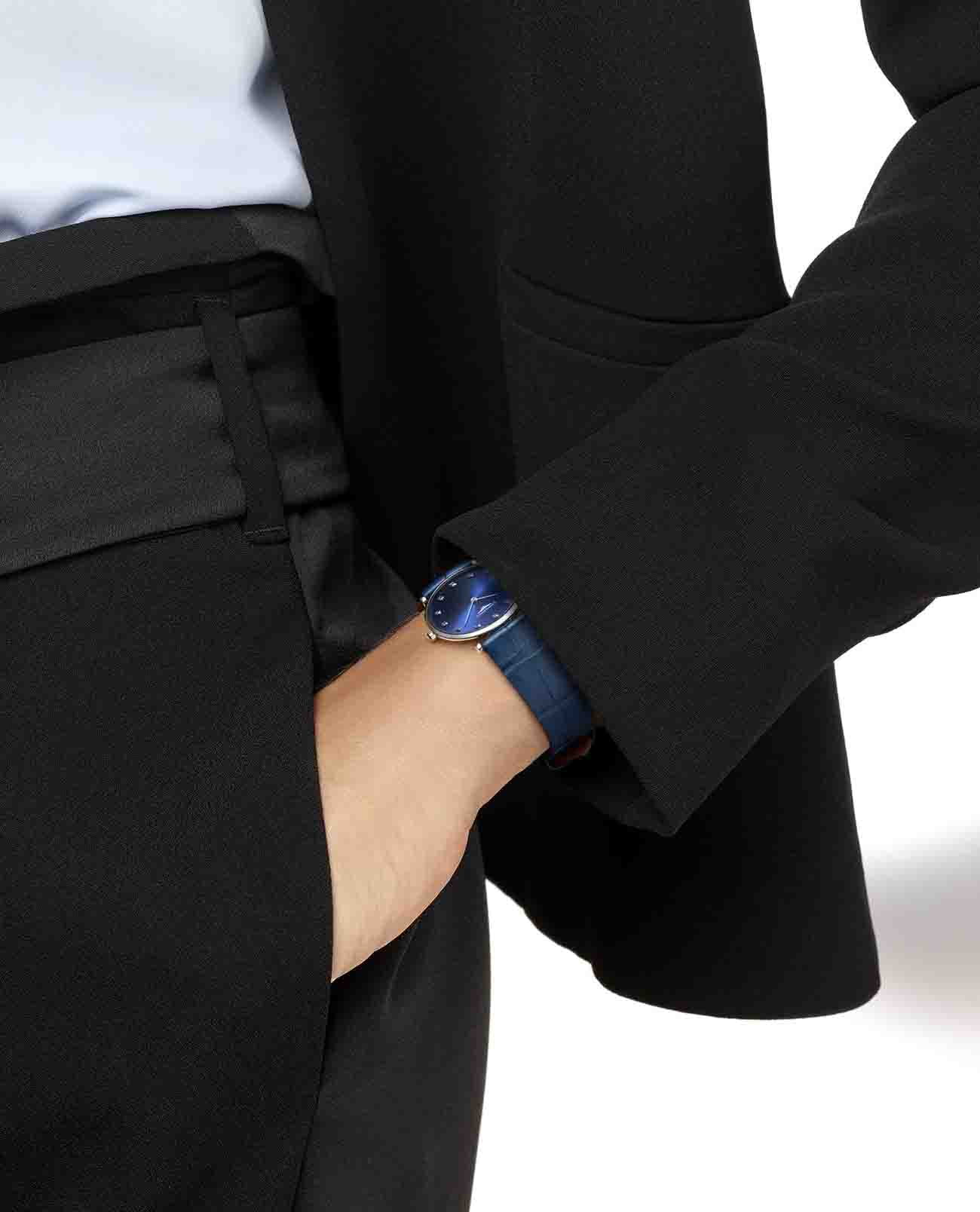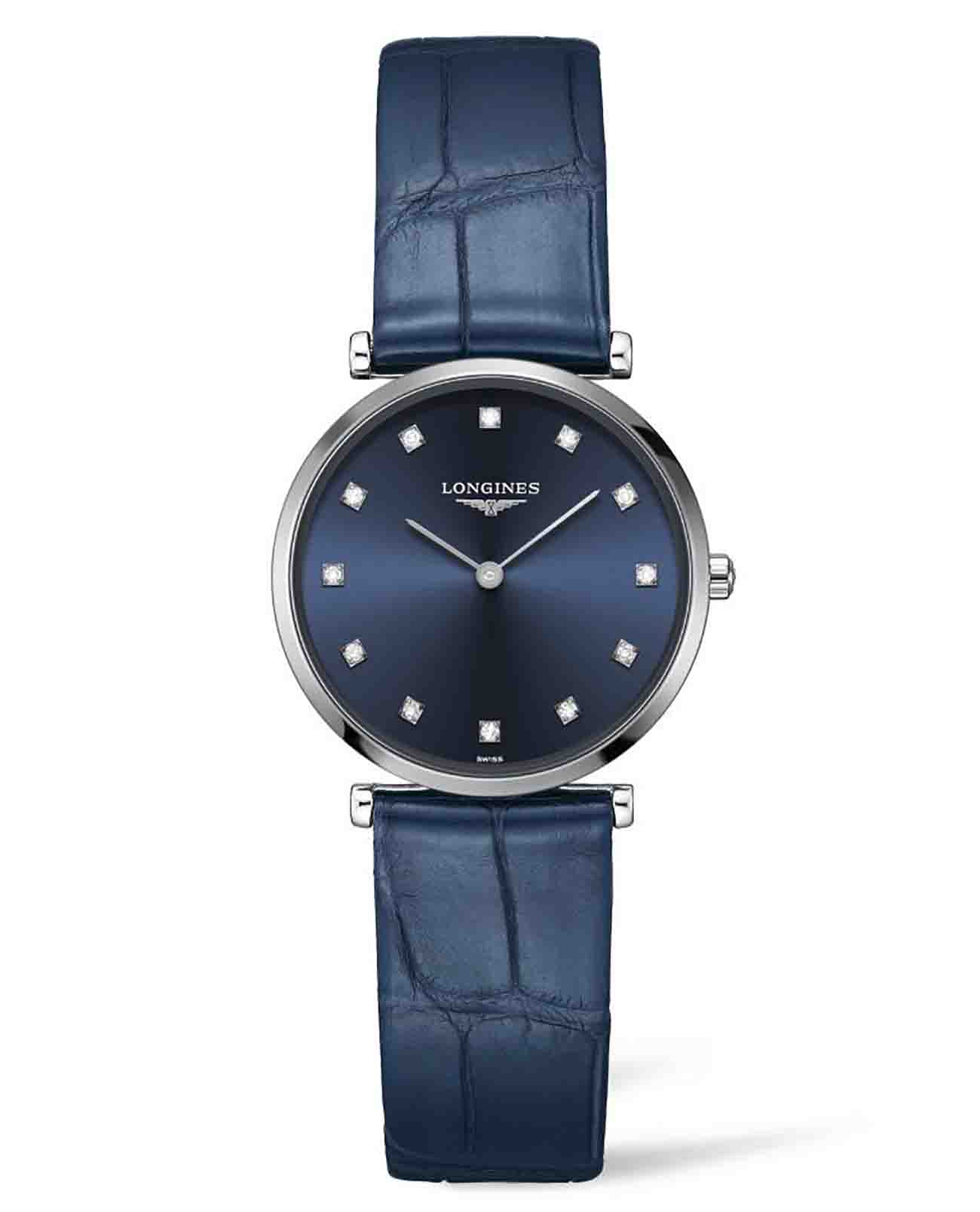Компактный синий циферблат украшен 12 бриллиантами общим весом 0,081 карата. Элегантным дополнением стал ремешок из кожи аллигатора. Швейцарский кварцевый калибр L420 обеспечивает высокую точность хода. Сапфировое стекло не допускает появления царапин на поверхности.