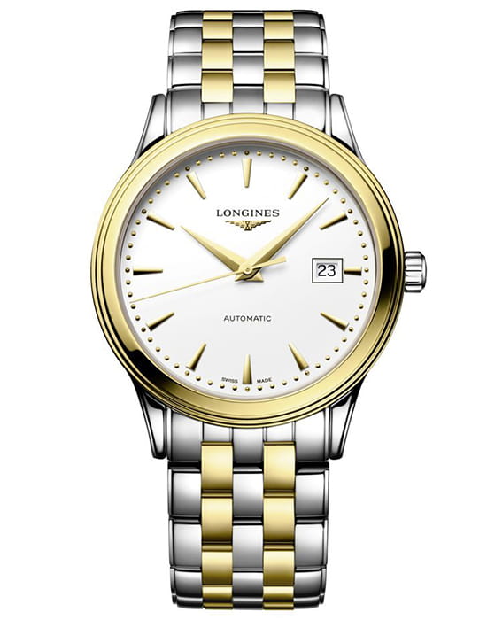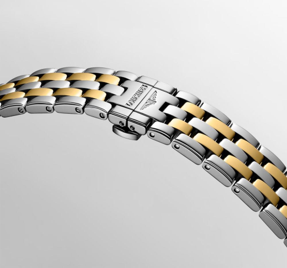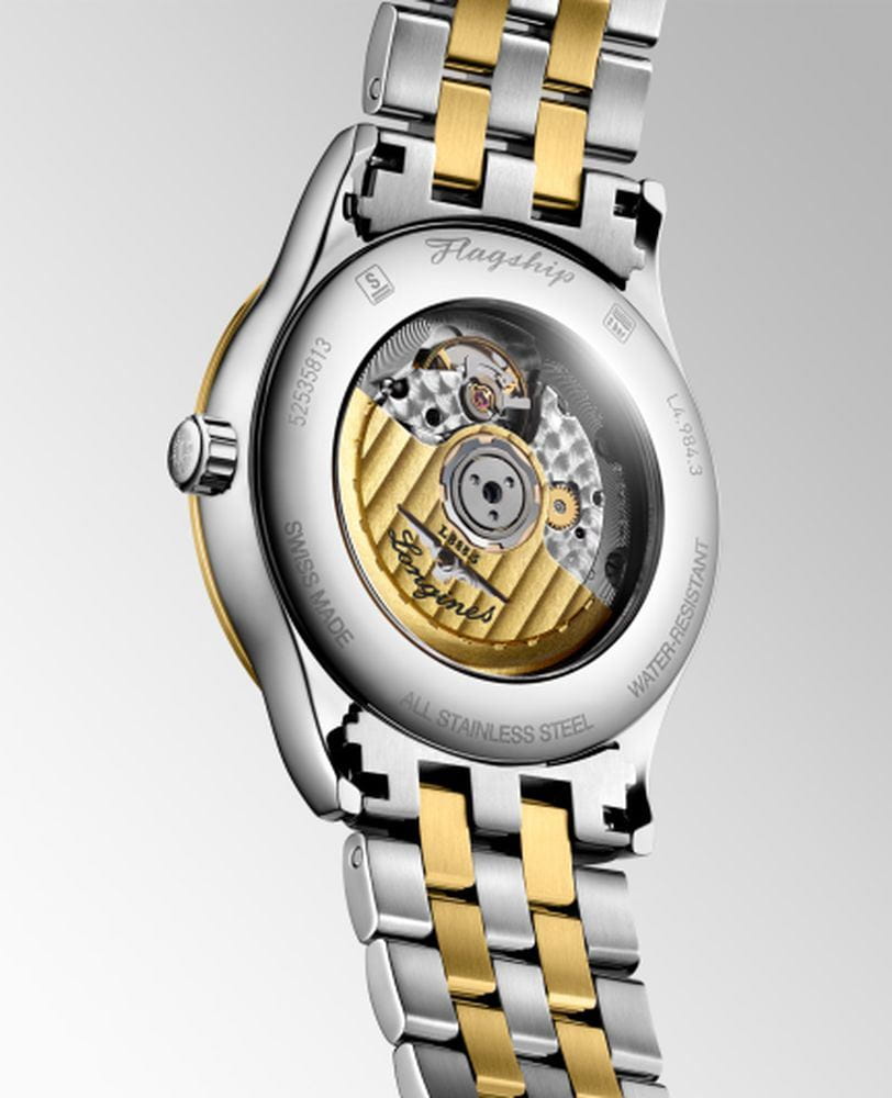 Longines L4.984.3.17.7 — классическая модель из серии Flagship Classic с утончённой эстетикой: корпус и браслет из нержавеющей стали с жёлтым PVDPVDУльтратонкое покрытие наносится в технике вакуумного напыления, сочетает в себе нитрид титана особой прочности со слоем золота или оксида хрома. Несёт в себе декоративную или защитную функцию.-покрытием, прозрачная задняя крышка из сапфира открывает вид на автоматический калибр L888 (25 200 пк/ч, монокристаллическая кремниевая пружина баланса), обеспечивающий запас хода до 72 ч ; выпуклое сапфировое стеклоСапфировое стеклоПрочный и надёжный материал из кристалла сапфира синтетического происхождения, характеризующийся особой твёрдостью и устойчивостью к царапинам и повреждениям. с несколькими слоями антибликового покрытияАнтибликовое покрытиеСлой оксида металла в 0,13-0,3 микрон, благодаря которому стекло часов не бликует и не отражает свет. Антибликовое покрытие уменьшает отражение света в 10 раз, обеспечивая отличную читаемость показателей циферблата. на внутренней стороне гарантирует отличную читаемость циферблата ; матовый белый циферблат украшен 13 бриллиантами Top Wesselton VS‑SI общим весом приблизительно 0,059 ct, стрелки — позолоченные . Диаметр корпуса 40 мм, толщина 8,7 мм, расстояние между ушками 21 мм, расстояние от ушка до ушка 47 мм, водозащита 3 бар (30 м), функции: часы, минуты, секунды и дата .