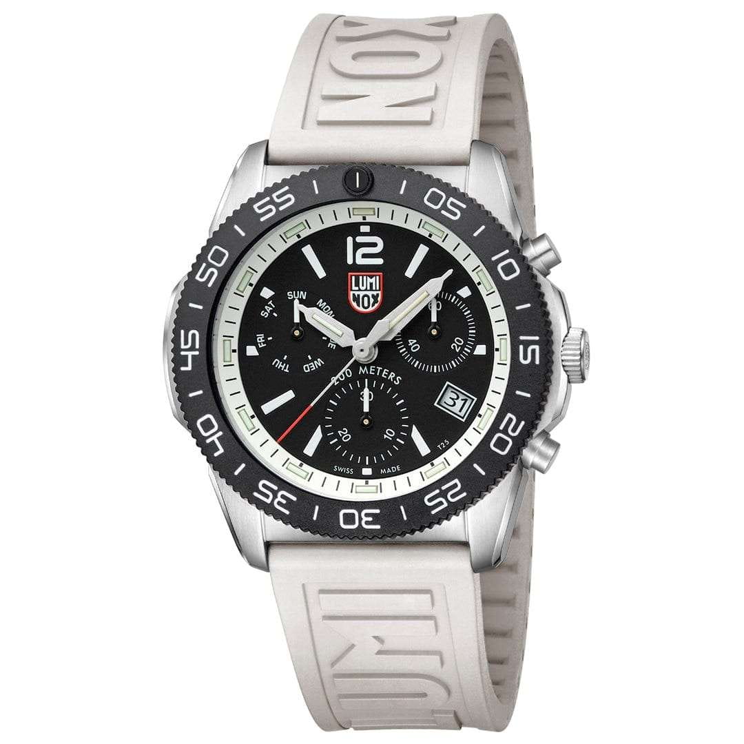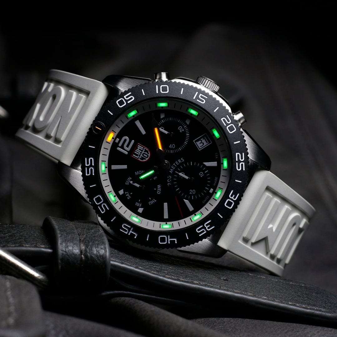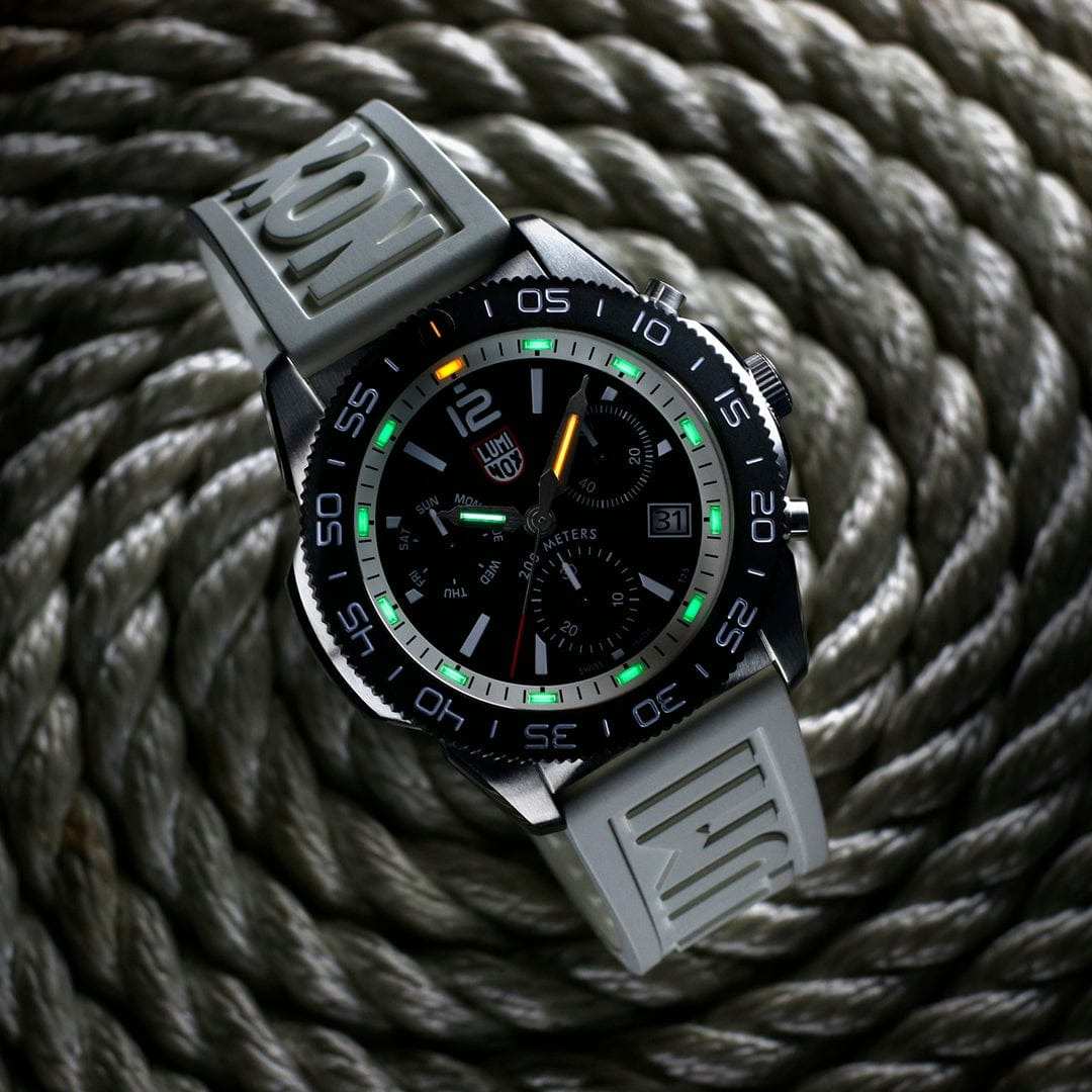 Швейцарские наручные часы Luminox Pacific Diver Chronograph XS.3141 – это идеальный симбиоз стиля и высокой функциональности. Оснащенные высокоточным кварцевым механизмом, они гарантируют безупречное времяизмерение и надежность в любом случае. Часы-хронографХронографФункция позволяет измерять отрезки времени с особой точностью: часы, минуты, секунды. Верным признаком хронографа является наличие на циферблате 3 дополнительных окошек-счётчиков. обладают функцией секундомераСекундомерСекундоме́р — прибор, способный измерять интервалы времени с точностью до долей секунды., что делает их практичными в использовании. Циферблат этих часов защищен сапфировым стекломСапфировое стеклоПрочный и надёжный материал из кристалла сапфира синтетического происхождения, характеризующийся особой твёрдостью и устойчивостью к царапинам и повреждениям. с антибликовым покрытиемАнтибликовое покрытиеСлой оксида металла в 0,13-0,3 микрон, благодаря которому стекло часов не бликует и не отражает свет. Антибликовое покрытие уменьшает отражение света в 10 раз, обеспечивая отличную читаемость показателей циферблата., которое славится своей прочностью и устойчивостью к царапинам, обеспечивая кристально чистый обзор. Корпус часов выполнен из качественной стали, что свидетельствует о долговечности и прочности изделия. Стрелки с LLTLLTLLT — это автономный механизм подсветки, основанный на использовании микроскопических газонаполненных элементов. Специальные герметичные капсулы из боросиликатного стекла, интегрированные в циферблат, генерируют свечение без необходимости подключения к внешним источникам энергии. Для их работы не требуется ни дополнительный свет, ни механическое воздействие (например, нажатие кнопки). Свечение возникает благодаря химическому процессу: реакция между тритием, заключенным в капсулах, и люминофорным покрытием создает стабильное автономное освещение. Технология обеспечивает энергетическую независимость и долговечность подсветки.-подсветкой, обеспечивают отличную видимость даже в условиях недостаточной освещенности, что делает их удобными для использования в любых условиях. Дополнительно часы располагают окошком даты в положении 4 часа, позволяющим быстро и удобно отслеживать текущую дату. Их внушительный класс водозащиты в 200 метров делает их идеальными для любителей водных видов спорта, таких как плавание и ныряние, не беспокоясь о повреждении механизма. Каучуковый ремешок, надёжно фиксирующий часы на запястье с помощью раскладной застёжкиРаскладная застёжкаТакой тип застёжки используется только на браслетах из металла. Она никогда не раскрывается полностью, происходит разделение на 2 и более частей. Раскладывающая застёжка снизит вероятность потери часов к минимуму., обеспечивает комфортное ношение в течение всего дня. Стильный вращающийся безельБезельВнешний ободок, закрепляющий стекло. В спортивных часах так называется поворотное кольцо с делениями на циферблате, выполняет роль таймера – замеряет отрезки времени на шкале. Неподвижный безель – элемент декора. Однонаправленно вращающийся безель на дайверских часах позволяет фиксировать моменты погружения и выныривания на поверхность., изготовленный из карбонаКарбонОт «carbon», «carbone» - углерод, углепластик - полимерный композиционный материал из переплетё