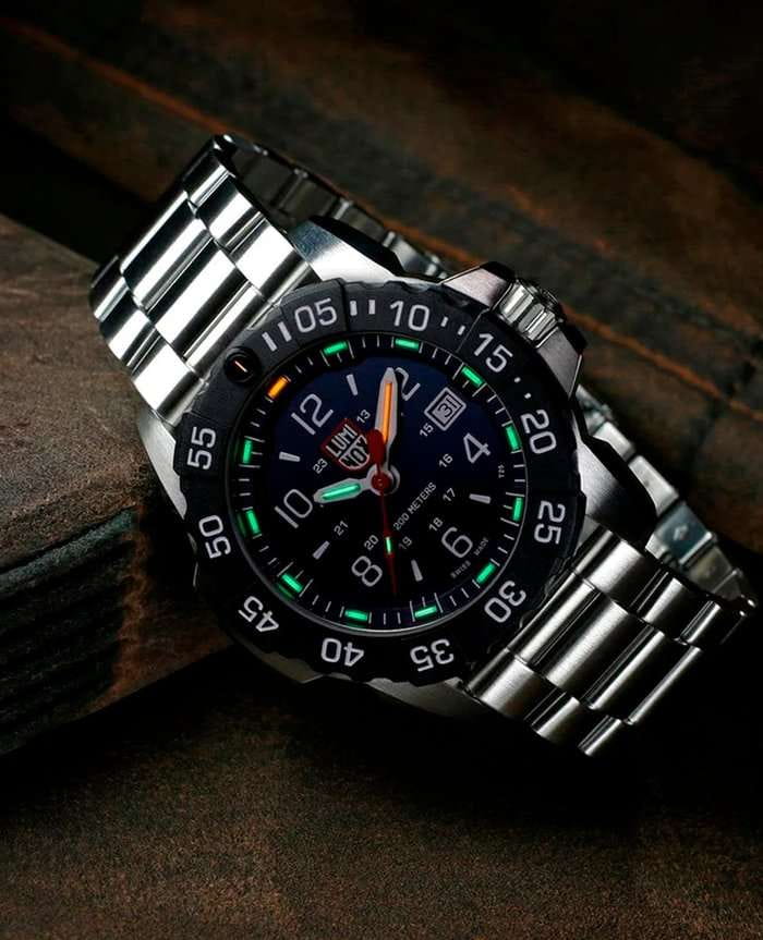 Мужские наручные часы Luminox XS.3254.CB из коллекции Navy SEAL сочетают в себе спортивный дизайн и надежность швейцарского качества . Модель обладает круглым корпусом диаметром 45 мм, изготовленным из стали икарбонаКарбонОт «carbon», «carbone» - углерод, углепластик - полимерный композиционный материал из переплетённых под определенным углом между собой нитей углеродного волокна, применяется для изготовления лёгких, но прочных деталей. В часах часто используют для украшения циферблатов и ремешков. Так же карбон используется в изготовлении корпусов. Такие корпуса обладают антикоррозионным свойством, не поддаются электромагнитному излучению, обладают повышенной прочностью и противоударностью. (CARBONOX™), что обеспечивает высокую устойчивость к внешним воздействиям при сохранении легкости . Циферблат черного цвета украшен контрастными метками и стрелками с люминесцентным покрытиемЛюминесцентное покрытиеПозволяет считывать показания времени в темноте. Производители наносят на стрелки, часовые индексы, безель или поверхность циферблата светонакопительный состав, дающий холодное свечение., гарантирующим постоянную видимость времени даже в условиях низкой освещенности благодаря системе LLTLLTLLT — это автономный механизм подсветки, основанный на использовании микроскопических газонаполненных элементов. Специальные герметичные капсулы из боросиликатного стекла, интегрированные в циферблат, генерируют свечение без необходимости подключения к внешним источникам энергии. Для их работы не требуется ни дополнительный свет, ни механическое воздействие (например, нажатие кнопки). Свечение возникает благодаря химическому процессу: реакция между тритием, заключенным в капсулах, и люминофорным покрытием создает стабильное автономное освещение. Технология обеспечивает энергетическую независимость и долговечность подсветки. (микрогазовые огни) . Часы оснащены кварцевым механизмом швейцарского производства Ronda 515, обеспечивающим точность хода ±15 секунд в месяц . Защиту циферблата обеспечивает прочное сапфировое стеклоСапфировое стеклоПрочный и надёжный материал из кристалла сапфира синтетического происхождения, характеризующийся особой твёрдостью и устойчивостью к царапинам и повреждениям. с антибликовым покрытиемАнтибликовое покрытиеСлой оксида металла в 0,13-0,3 микрон, благодаря которому стекло часов не бликует и не отражает свет. Антибликовое покрытие уменьшает отражение света в 10 раз, обеспечивая отличную читаемость показателей циферблата., устойчивое к царапинам и механическим повреждениям . Водонепроницаемость модели достигает 20 атмосфер (200 метров), что делает их подходящими для плавания и активного отдыха на воде, включая дайвинг. Модель также оснащена безелемБезельВнешний ободок, закрепляющий стекло. В спортивных часах так называется поворотное кольцо с делениями на циферблате, выполняет роль таймера – замеряет отрезки времени на шкале. Неподвижный безель – элемент декора. Однонаправленно вращающийся безель на дайверских часах позволяет фиксировать моменты погружения и выныривания на поверхность. с односторонним вращением, что добавляет функциональности при использовании в водных условиях .Стальной браслет на раскладной застёжкеРаскладная застёжкаТакой тип застёжки используется только на браслетах из мета