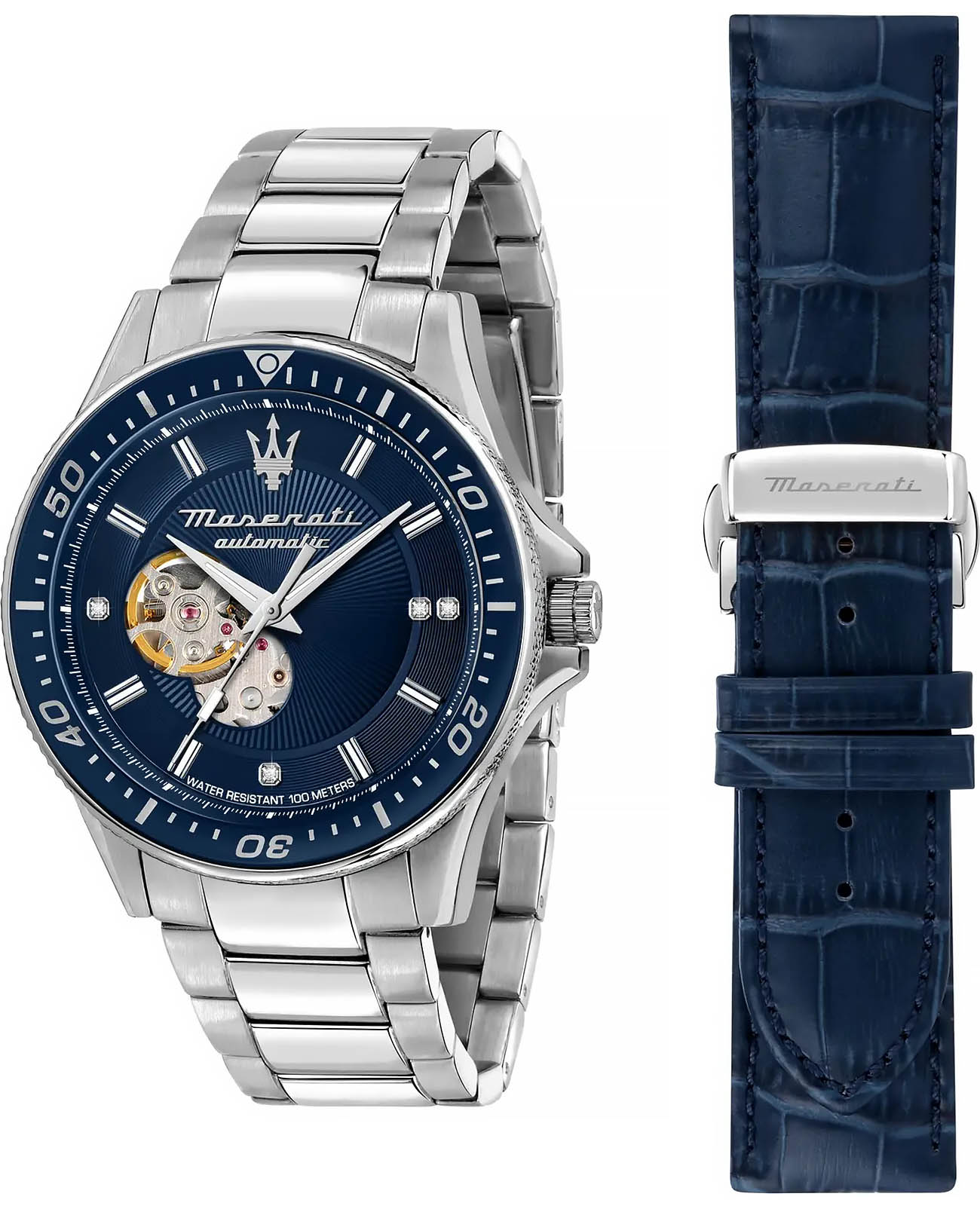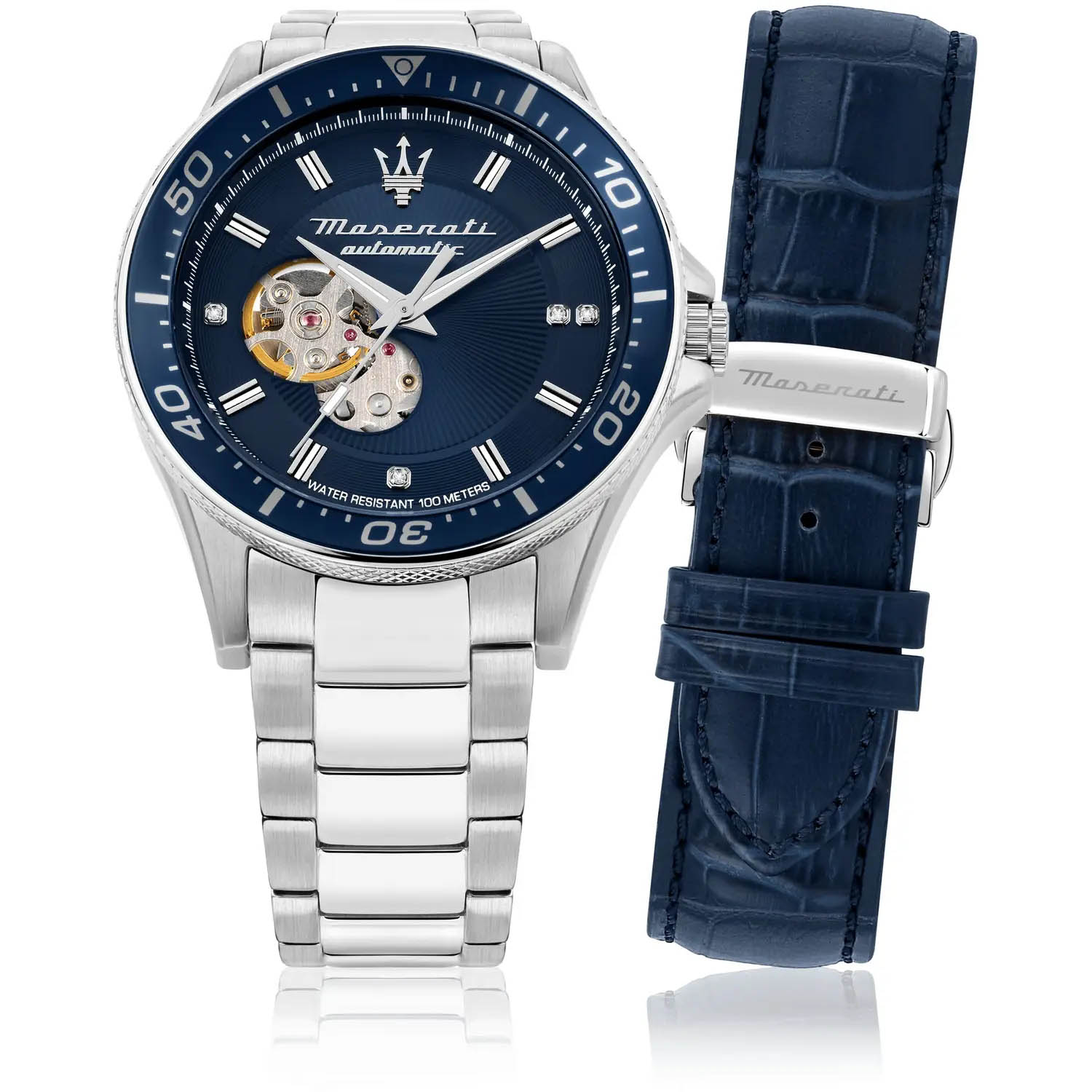 Механический механизм (автоматический калибр) с высокой точностью. Сапфировое стеклоСапфировое стеклоПрочный и надёжный материал из кристалла сапфира синтетического происхождения, характеризующийся особой твёрдостью и устойчивостью к царапинам и повреждениям. устойчивое к появлению царапин, обладающее высокой прозрачностью. Циферблат украшен бриллиантами. Стрелки с люминесцентным покрытиемЛюминесцентное покрытиеПозволяет считывать показания времени в темноте. Производители наносят на стрелки, часовые индексы, безель или поверхность циферблата светонакопительный состав, дающий холодное свечение.. БезельБезельВнешний ободок, закрепляющий стекло. В спортивных часах так называется поворотное кольцо с делениями на циферблате, выполняет роль таймера – замеряет отрезки времени на шкале. Неподвижный безель – элемент декора. Однонаправленно вращающийся безель на дайверских часах позволяет фиксировать моменты погружения и выныривания на поверхность. поворотный. Класс водозащиты: 100 метров, позволит плавать, нырять и заниматься другими водными видами спорта. Корпус часов изготовлен из нержавеющей стали. Браслет с застёжкой «бабочка» с кнопкамиЗастёжка "бабочка"Такой вид застёжки дополняется предохранителями, помогающими избежать случайного раскрытия браслета. Обладают изящным исполнением. . Дополнительный ремешок в комплекте.