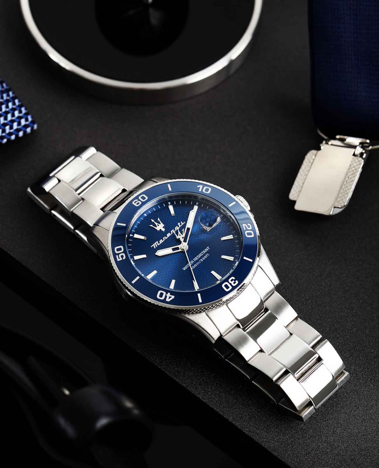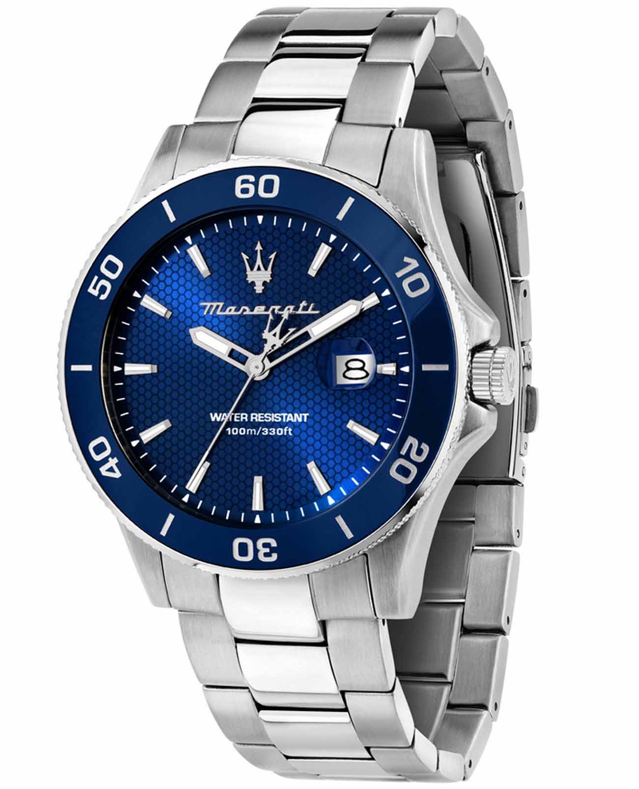 Мужские итальянские часы Maserati Competizione R8853100036, кварцевый механизм с высокой точностью. Корпус часов изготовлен из стали. БезельБезельВнешний ободок, закрепляющий стекло. В спортивных часах так называется поворотное кольцо с делениями на циферблате, выполняет роль таймера – замеряет отрезки времени на шкале. Неподвижный безель – элемент декора. Однонаправленно вращающийся безель на дайверских часах позволяет фиксировать моменты погружения и выныривания на поверхность. из стали с PVD-покрытиемPVDУльтратонкое покрытие наносится в технике вакуумного напыления, сочетает в себе нитрид титана особой прочности со слоем золота или оксида хрома. Несёт в себе декоративную или защитную функцию.. Стрелки с люминесцентным покрытиемЛюминесцентное покрытиеПозволяет считывать показания времени в темноте. Производители наносят на стрелки, часовые индексы, безель или поверхность циферблата светонакопительный состав, дающий холодное свечение.. Класс водозащиты: 100 метров, позволит плавать, нырять и заниматься другими водными видами спорта. Стальной браслет на раскладной застёжкойРаскладная застёжкаТакой тип застёжки используется только на браслетах из металла. Она никогда не раскрывается полностью, происходит разделение на 2 и более частей. Раскладывающая застёжка снизит вероятность потери часов к минимуму..