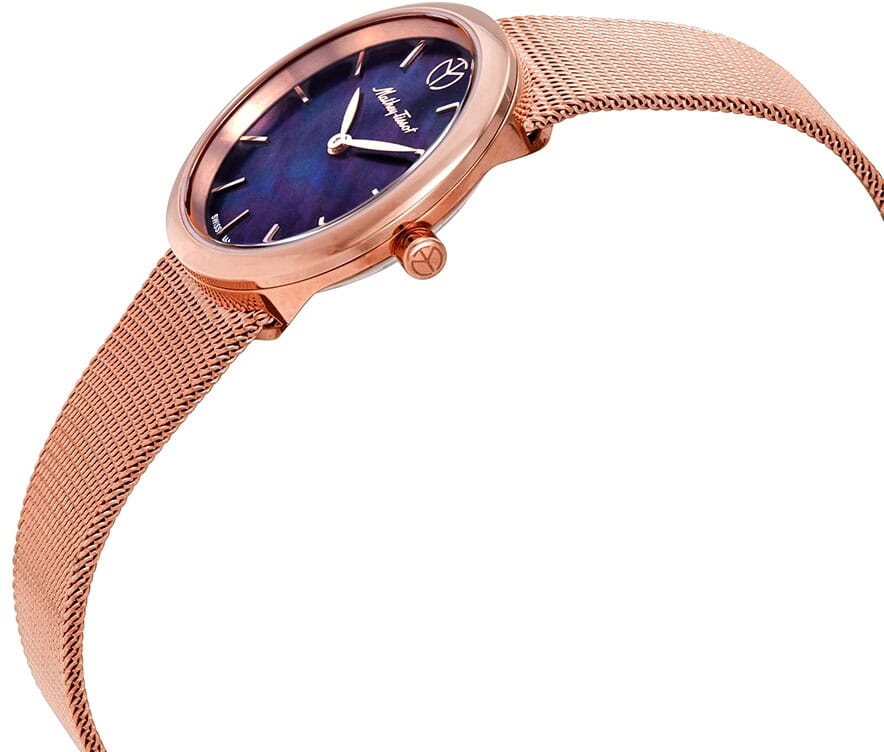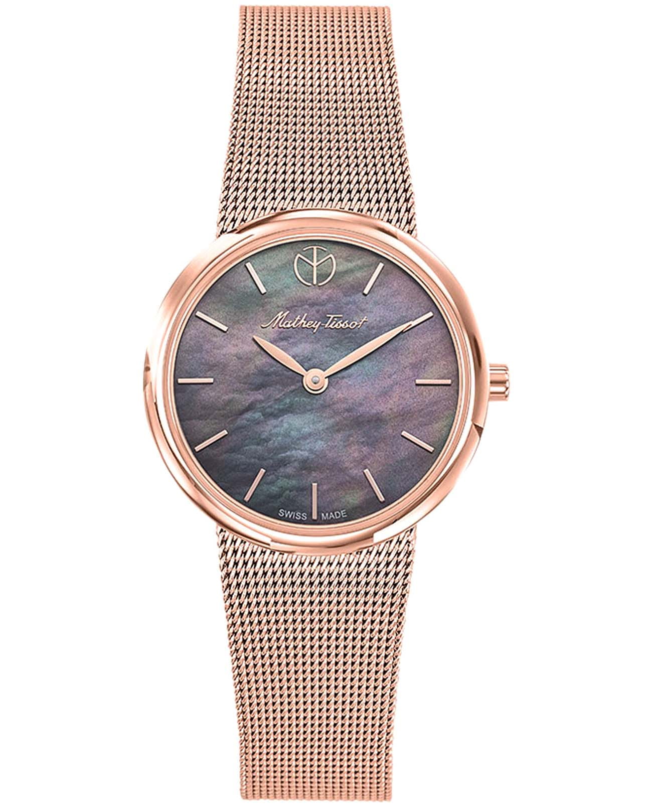 Женские кварцевые часы Mathey-Tissot Milly D403PN — это стильное сочетание элегантности и современного дизайна. Изящный корпус выполнен из нержавеющей стали с PVD-покрытиемPVDУльтратонкое покрытие наносится в технике вакуумного напыления, сочетает в себе нитрид титана особой прочности со слоем золота или оксида хрома. Несёт в себе декоративную или защитную функцию. цвета розового золота, диаметром 30 мм, что придаст образу элегантности и надежности. Изысканный перламутровый циферблат с метками в виде штрихов придает модели особый блеск. Циферблат защищен минеральным стекломМинеральное стеклоМинеральное стекло представляет собой искусственно выращенный минерал кварца. Такое стекло отличается особой устойчивостью к повреждениям и царапинам. Уступает по некоторым качествам сапфировому стеклу. с сапфировым покрытием, обеспечивает устойчивость к царапинам. Часы оснащены надежным кварцевым механизмом. Стальной браслет с PVD-покрытиемPVDУльтратонкое покрытие наносится в технике вакуумного напыления, сочетает в себе нитрид титана особой прочности со слоем золота или оксида хрома. Несёт в себе декоративную или защитную функцию. миланского плетения на раскладном замкеРаскладная застёжкаТакой тип застёжки используется только на браслетах из металла. Она никогда не раскрывается полностью, происходит разделение на 2 и более частей. Раскладывающая застёжка снизит вероятность потери часов к минимуму., гарантирует комфортное и безопасное ношение. Класс водозащиты: 30 метров позволит защитить корпус от случайных брызг или капель дождя. Mathey-Tissot  — отличный выбор для тех, кто ценит утонченность и качество.