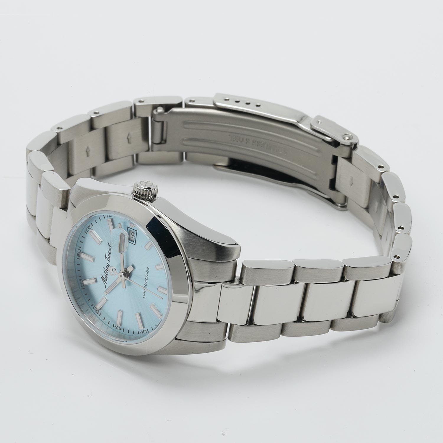 Женские кварцевые часы Mathey-Tissot Mathy D451BU — это стильное сочетание элегантности и современного дизайна. Лимитированная серия. Изящный корпус выполнен из нержавеющей стали, диаметром 32 мм, что придаст образу женственности и романтизма. Изысканный циферблат с метками в виде штрихов придает модели особый блеск. Циферблат защищен минеральным стекломМинеральное стеклоМинеральное стекло представляет собой искусственно выращенный минерал кварца. Такое стекло отличается особой устойчивостью к повреждениям и царапинам. Уступает по некоторым качествам сапфировому стеклу., обеспечивающий устойчивость к царапинам. Стрелки и метки с люминесцентным покрытиемЛюминесцентное покрытиеПозволяет считывать показания времени в темноте. Производители наносят на стрелки, часовые индексы, безель или поверхность циферблата светонакопительный состав, дающий холодное свечение.. Окошко даты находится в положении 3 часа. Часы оснащены надежным кварцевым механизмом. Стальной браслет на раскладной застёжке с фиксаторомРаскладная застёжкаТакой тип застёжки используется только на браслетах из металла. Она никогда не раскрывается полностью, происходит разделение на 2 и более частей. Раскладывающая застёжка снизит вероятность потери часов к минимуму., гарантирует комфортное и безопасное ношение. Класс водозащиты: 50 метров позволит защитить корпус от случайных брызг или капель дождя. Mathey-Tissot  — отличный выбор для тех, кто ценит утонченность и качество.