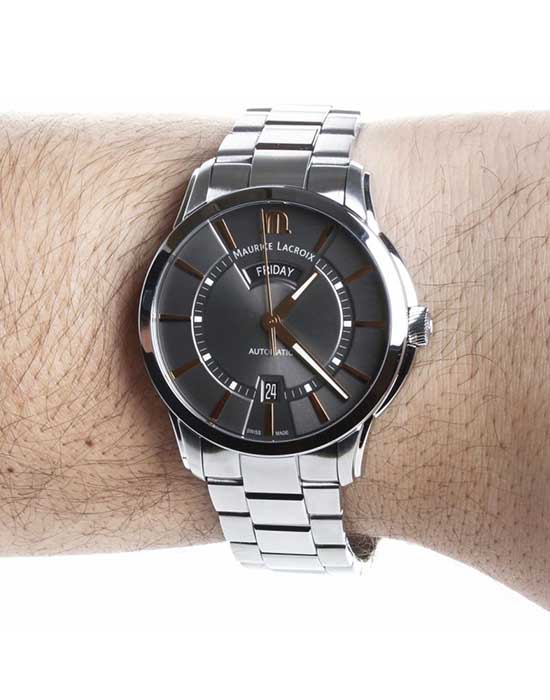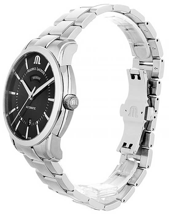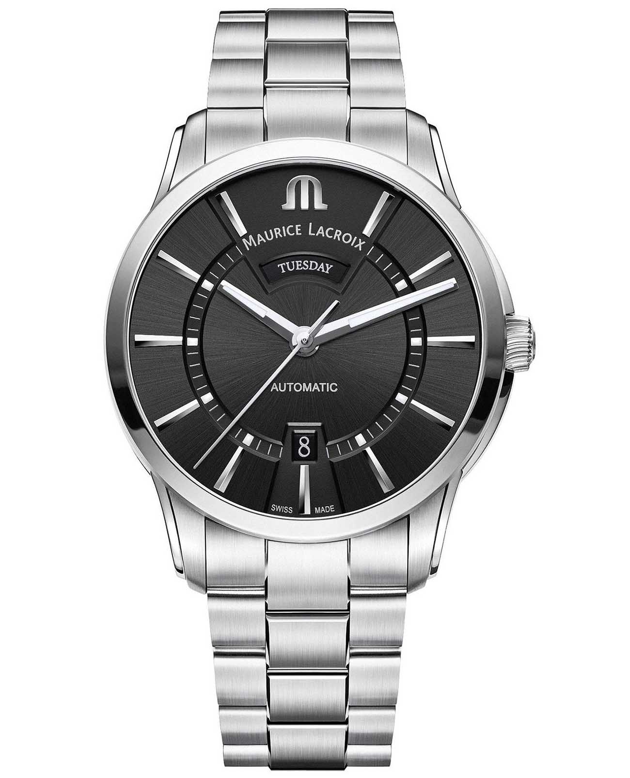 Мужские швейцарские механические часы с автоподзаводом Maurice Lacroix Pontos Day Date PT6358-SS002-330-1, механический механизм (автоматический калибр) с высокой точностью. Сапфировое стеклоСапфировое стеклоПрочный и надёжный материал из кристалла сапфира синтетического происхождения, характеризующийся особой твёрдостью и устойчивостью к царапинам и повреждениям. устойчивое к появлению царапин, обладающее высокой прозрачностью. Корпус и браслет часов изготовлены из нержавеющей стали. Окошко дня недели в положени 12 часов, окошко даты в положении 6 часов. Стрелки с люминесцентным покрытиемЛюминесцентное покрытиеПозволяет считывать показания времени в темноте. Производители наносят на стрелки, часовые индексы, безель или поверхность циферблата светонакопительный состав, дающий холодное свечение.. Класс водозащиты: 100 метров, позволит плавать, нырять и заниматься другими водными видами спорта. Стальной браслет на застёжке-бабочке с кнопкамиЗастёжка "бабочка"Такой вид застёжки дополняется предохранителями, помогающими избежать случайного раскрытия браслета. Обладают изящным исполнением. .