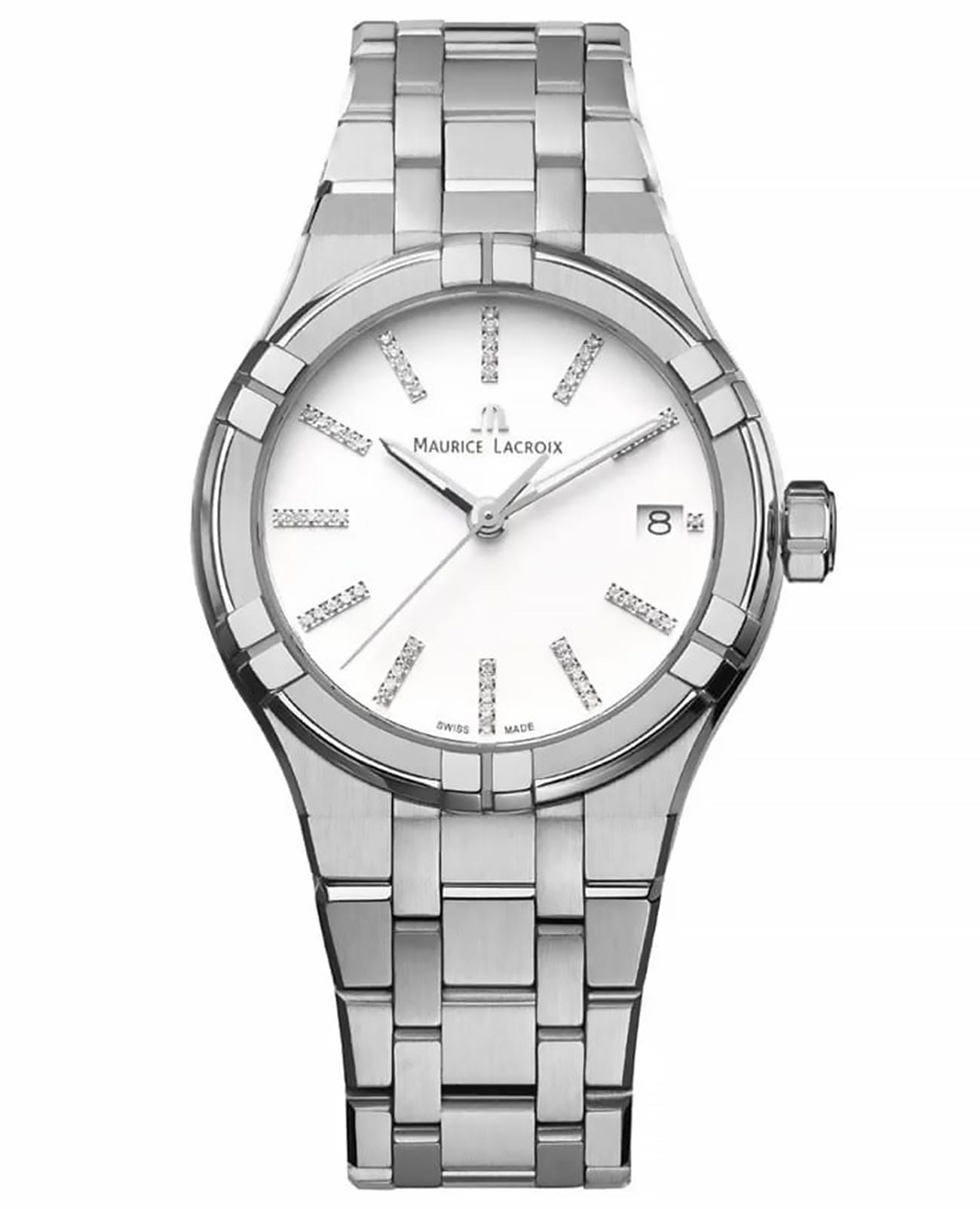 Мужские швейцарские кварцевые часы Maurice Lacroix Aikon Quartz AI1106-SS002-150-1. Сапфировое стеклоСапфировое стеклоПрочный и надёжный материал из кристалла сапфира синтетического происхождения, характеризующийся особой твёрдостью и устойчивостью к царапинам и повреждениям. устойчивое к появлению царапин, обладающее высокой прозрачностью. Белый циферблат. Стрелки с люминесцентным покрытиемЛюминесцентное покрытиеПозволяет считывать показания времени в темноте. Производители наносят на стрелки, часовые индексы, безель или поверхность циферблата светонакопительный состав, дающий холодное свечение.. Метки на циферблате украшены бриллиантами. Класс водозащиты: 100 метров, позволит плавать, нырять и заниматься другими водными видами спорта. Окошко даты находится в положении 3 часов. Корпус и браслет часов изготовлены из стали с частичным. Браслет с застёжкой «бабочка» с кнопкамиЗастёжка "бабочка"Такой вид застёжки дополняется предохранителями, помогающими избежать случайного раскрытия браслета. Обладают изящным исполнением. .