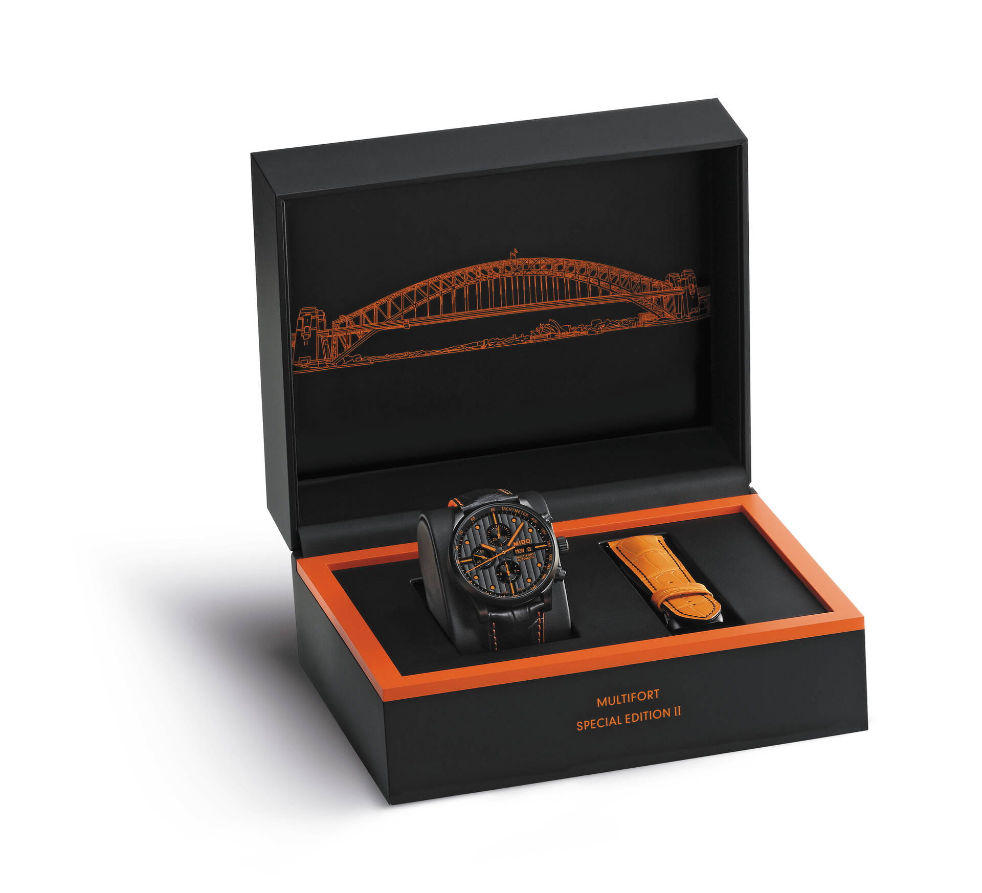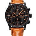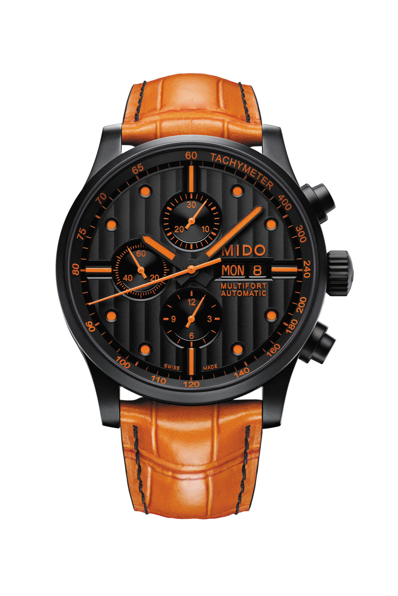 Мужские швейцарские механические часы с хронографом Mido Multifort Chronograph M005.614.36.051.22, механический механизм (автоматический калибр) с высокой точностью. Благодаря трем счетчикам, черному циферблату и оранжевым накладным меткам и стрелкам эти часы-хронограф Multifort Chronograph Special Edition выглядят чрезвычайно эффектно. Сапфировое стекло устойчивое к появлению царапин, обладающее высокой прозрачностью. Класс водозащиты: 100 метров, позволит плавать, нырять и заниматься другими водными видами спорта. Корпус часов изготовлен из стали, с PVD покрытием черного цвета. Прозрачная задняя крышка, завинчивающаяся заводная головка. Часы предлагаются в комплекте с двумя сменными ремешками черного и оранжевого цвета.