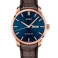 Часы MIDO Belluna Sunray (артикул M024.630.36.041.00) — элегантная модель, сочетающая современный дизайн и швейцарское качество. Корпус диаметром 42,5 мм выполнен из нержавеющей стали с PVD-покрытиемPVDУльтратонкое покрытие наносится в технике вакуумного напыления, сочетает в себе нитрид титана особой прочности со слоем золота или оксида хрома. Несёт в себе декоративную или защитную функцию. розового золота и водозащитой до 5 бар (50 метров). Синий циферблат с гильошированным узором «солнечные лучи» и накладными часовыми метками защищён сапфировым стекломСапфировое стеклоПрочный и надёжный материал из кристалла сапфира синтетического происхождения, характеризующийся особой твёрдостью и устойчивостью к царапинам и повреждениям. с двусторонним антибликовым покрытием.