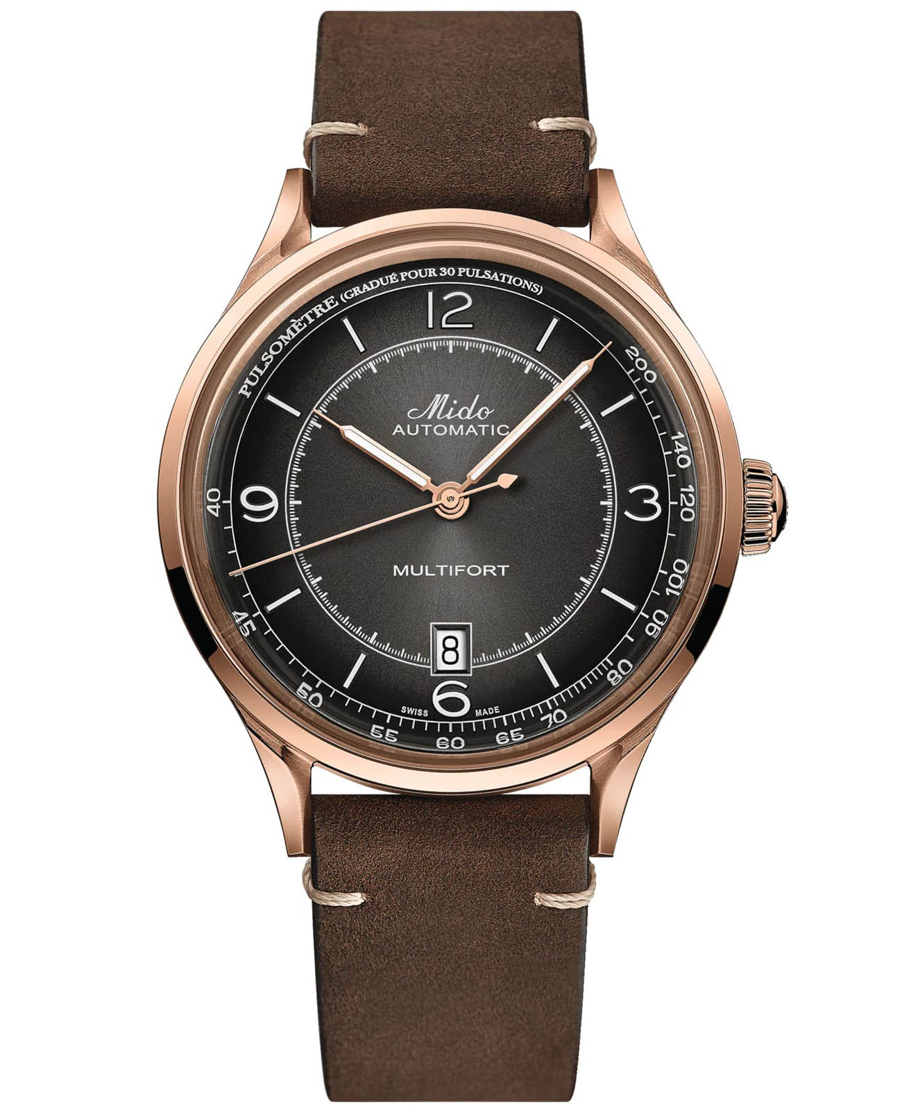Часы MIDO Multifort Patrimony (артикул M040.407.36.060.00) сочетают элегантный ретро-дизайн и современные технологии, вдохновлённые историческими моделями MIDO. Корпус диаметром 40 мм выполнен из нержавеющей стали с PVD-покрытиемPVDУльтратонкое покрытие наносится в технике вакуумного напыления, сочетает в себе нитрид титана особой прочности со слоем золота или оксида хрома. Несёт в себе декоративную или защитную функцию. цвета розового золота и водозащитой до 5 бар (50 метров). Прозрачная задняя крышка подчёркивает изысканный механизм. Антрацитовый циферблат с градиентным эффектом оснащён накладными часовыми метками и арабскими цифрами с покрытием Super-LumiNova®Люминесцентное покрытиеПозволяет считывать показания времени в темноте. Производители наносят на стрелки, часовые индексы, безель или поверхность циферблата светонакопительный состав, дающий холодное свечение.. Шкала пульсометра добавляет уникальный элемент дизайна, а окошко даты расположено в положении «6 часов». Циферблат защищён сапфировым стекломСапфировое стеклоПрочный и надёжный материал из кристалла сапфира синтетического происхождения, характеризующийся особой твёрдостью и устойчивостью к царапинам и повреждениям. с антибликовым покрытием.
