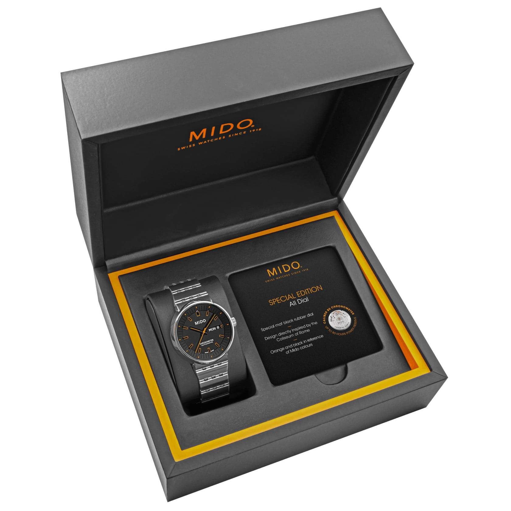 Мужские швейцарские механические часы с хронометром Mido All Dial Chronometer M8340.4.18.19, механический механизм (автоматический калибр) с высокой точностью. Сапфировое стекло устойчивое к появлению царапин, обладающее высокой прозрачностью. Класс водозащиты: 100 метров, позволит плавать, нырять и заниматься другими водными видами спорта. Корпус часов изготовлен из стали, серебристого цвета. Стиль часов All Dial навеян архитектурой римского Колизея. Эффектный черный циферблат с цветными элементами обыгрывает образ знаменитого древнеримского сооружения: его структура напоминает вид на Колизей с высоты птичьего полета.