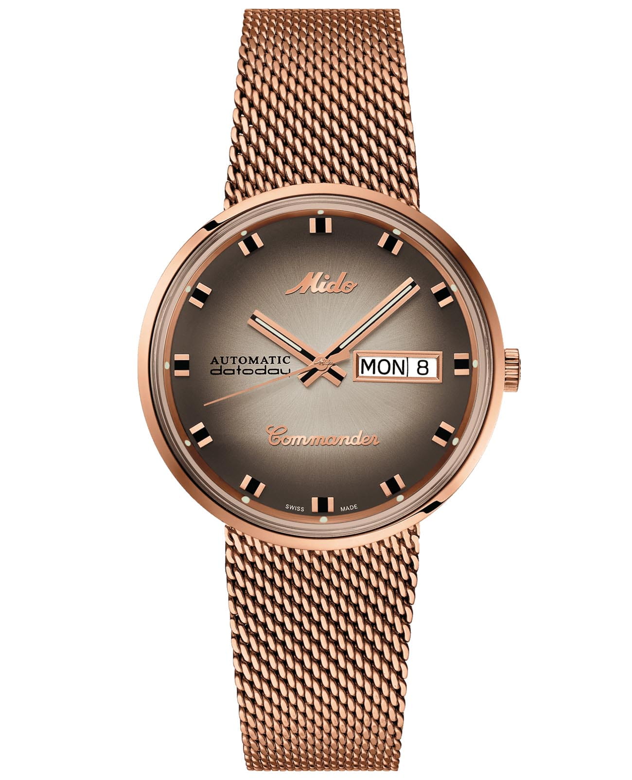 Мужские швейцарские механические часы с сапфировым стеклом Mido Commander Shade M8429.3.23.11, механический механизм (автоматический калибр) с высокой точностью. Класс водозащиты: 50 метров, позволит защитить корпус от случайных брызг или капель дождя. Корпус часов изготовлен из стали, розового цвета.