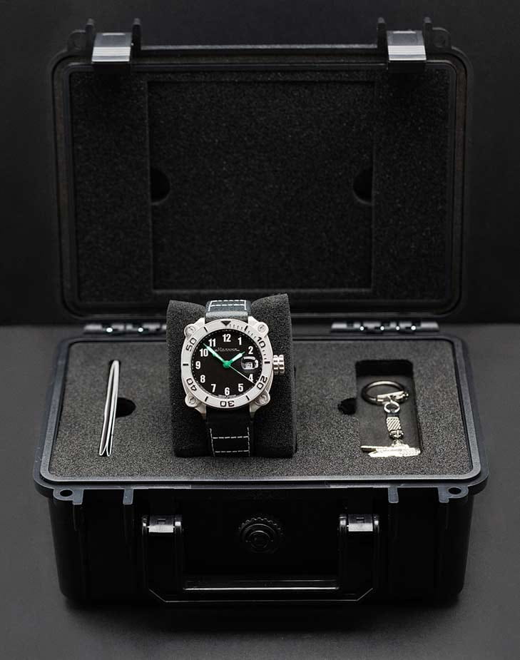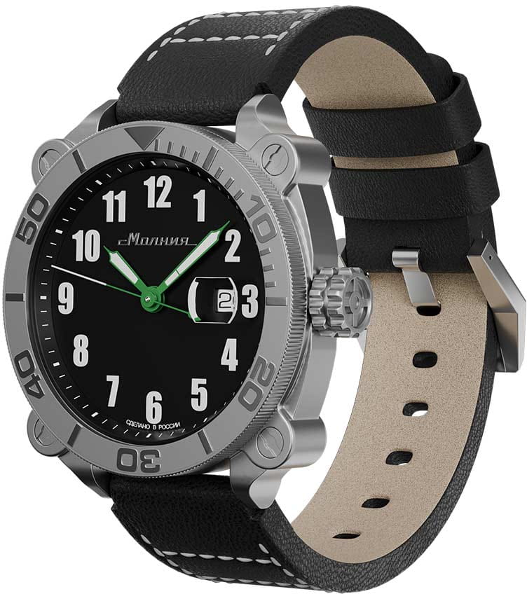 Мужские механические часы с автоподзаводом от бренда «МОЛНИЯ» — это стильный аксессуар, вдохновлённый дизайном приборной панели легендарного танка Т-72. Корпус диаметром 42 мм и толщиной 12 мм выполнен из нержавеющей стали 316L с матовой полировкой. БезельБезельВнешний ободок, закрепляющий стекло. В спортивных часах так называется поворотное кольцо с делениями на циферблате, выполняет роль таймера – замеряет отрезки времени на шкале. Неподвижный безель – элемент декора. Однонаправленно вращающийся безель на дайверских часах позволяет фиксировать моменты погружения и выныривания на поверхность. однонаправленный, вращающийся. Циферблат чёрного цвета оформлен арабскими цифрами и логотипом бренда. Окошко даты расположено в положении 3 часов и оснащено увеличительным стеклом. Стрелки и метки с люминесцентным покрытиемЛюминесцентное покрытиеПозволяет считывать показания времени в темноте. Производители наносят на стрелки, часовые индексы, безель или поверхность циферблата светонакопительный состав, дающий холодное свечение. Super-LumiNova. Циферблат защищён сапфировым стекломСапфировое стеклоПрочный и надёжный материал из кристалла сапфира синтетического происхождения, характеризующийся особой твёрдостью и устойчивостью к царапинам и повреждениям. с антибликовым покрытиемАнтибликовое покрытиеСлой оксида металла в 0,13-0,3 микрон, благодаря которому стекло часов не бликует и не отражает свет. Антибликовое покрытие уменьшает отражение света в 10 раз, обеспечивая отличную читаемость показателей циферблата.. Механизм — японский автоматический калибр Miyota 8215 запас хода до 42 часов. Заводная головка стилизована под гусеничную ленту, задняя крышка с гравировкой танка Т-72. Часы оснащены кожаным ремешком чёрного цвета с классической пряжкой и системой быстрой замены. Водонепроницаемость 100 м позволяет использовать часы для плавания и повседневного ношения. Идеальный выбор для тех, кто ценит инженерное наследие и мощный дизайн.