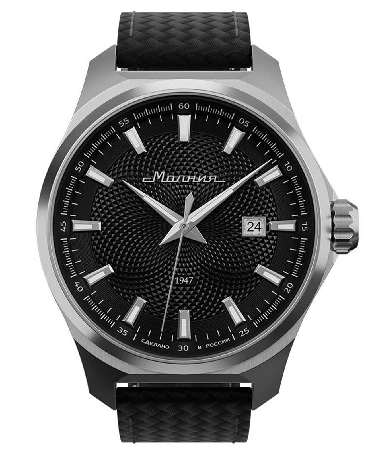 Мужские механические часы с автоподзаводом — это надёжный аксессуар от легендарного бренда «МОЛНИЯ», созданный на Челябинском часовом заводе. Корпус диаметром 42 мм выполнен из нержавеющей стали 316L с зеркальной полировкой. БезельБезельВнешний ободок, закрепляющий стекло. В спортивных часах так называется поворотное кольцо с делениями на циферблате, выполняет роль таймера – замеряет отрезки времени на шкале. Неподвижный безель – элемент декора. Однонаправленно вращающийся безель на дайверских часах позволяет фиксировать моменты погружения и выныривания на поверхность. также выполнен из стали с зеркальной отделкой. Циферблат чёрного цвета оформлен индексами и стрелками. Окошко даты расположено в положении 3 часов. Стрелки и метки с люминесцентным покрытиемЛюминесцентное покрытиеПозволяет считывать показания времени в темноте. Производители наносят на стрелки, часовые индексы, безель или поверхность циферблата светонакопительный состав, дающий холодное свечение. Super-LumiNova, обеспечивающим хорошую читаемость в темноте. Циферблат защищён сапфировым стекломСапфировое стеклоПрочный и надёжный материал из кристалла сапфира синтетического происхождения, характеризующийся особой твёрдостью и устойчивостью к царапинам и повреждениям. с антибликовым покрытиемАнтибликовое покрытиеСлой оксида металла в 0,13-0,3 микрон, благодаря которому стекло часов не бликует и не отражает свет. Антибликовое покрытие уменьшает отражение света в 10 раз, обеспечивая отличную читаемость показателей циферблата.. Механизм — японский автоматический калибр Miyota 8215 с функцией и запасом хода до 42 часов. Прозрачная задняя крышка позволяет наблюдать за работой механизма с кастомным ротором. Часы оснащены кожаным ремешком чёрного цвета с подкладкой из фтористого каучука и классической пряжкой, а также системой быстрой замены. Водонепроницаемость 100 м позволяет использовать часы для плавания и повседневного ношения. Идеальный выбор для тех, кто ценит качество, точность и стиль.