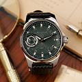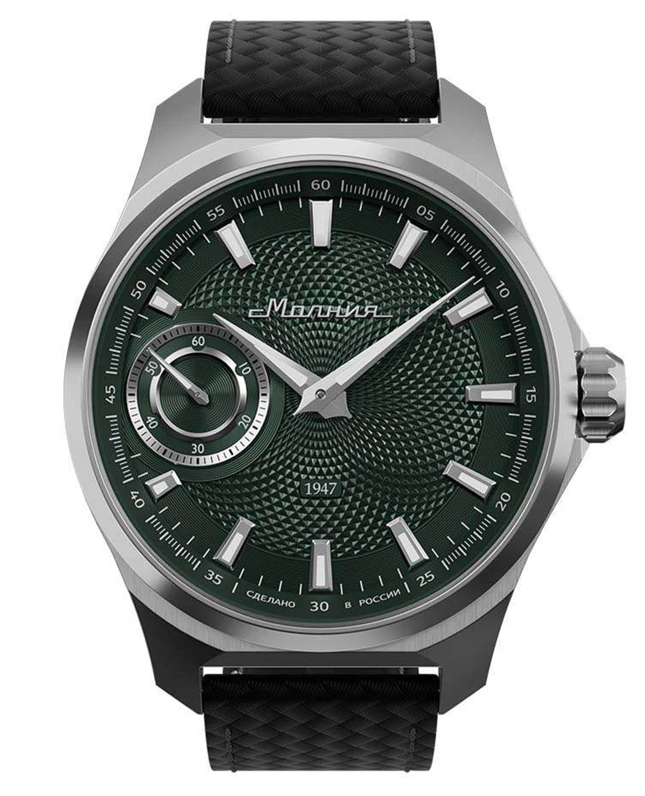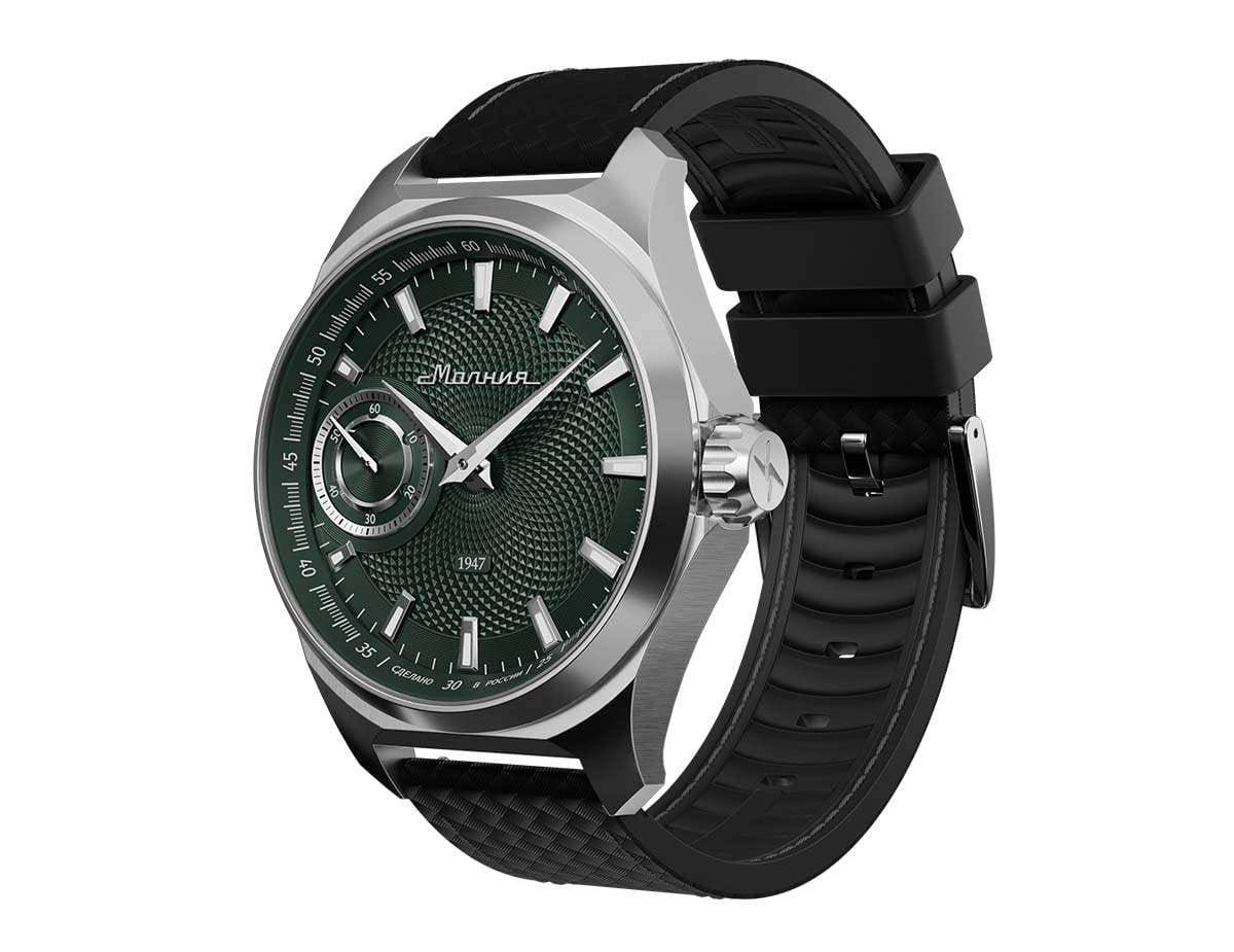 Мужские механические часы с ручным подзаводом — это аксессуар от легендарного бренда «МОЛНИЯ», созданный на Челябинском часовом заводе. Корпус диаметром 42 мм выполнен из нержавеющей стали 316L с зеркальной полировкой. БезельБезельВнешний ободок, закрепляющий стекло. В спортивных часах так называется поворотное кольцо с делениями на циферблате, выполняет роль таймера – замеряет отрезки времени на шкале. Неподвижный безель – элемент декора. Однонаправленно вращающийся безель на дайверских часах позволяет фиксировать моменты погружения и выныривания на поверхность. также выполнен из стали с зеркальной отделкой. Циферблат зелёного цвета оформлен индексами и стрелками. Малая секундная стрелка вынесена на позицию 9 часов. Стрелки и метки с люминесцентным покрытиемЛюминесцентное покрытиеПозволяет считывать показания времени в темноте. Производители наносят на стрелки, часовые индексы, безель или поверхность циферблата светонакопительный состав, дающий холодное свечение. Super-LumiNova, обеспечивающим хорошую читаемость в темноте. Циферблат защищён сапфировым стекломСапфировое стеклоПрочный и надёжный материал из кристалла сапфира синтетического происхождения, характеризующийся особой твёрдостью и устойчивостью к царапинам и повреждениям. с антибликовым покрытиемАнтибликовое покрытиеСлой оксида металла в 0,13-0,3 микрон, благодаря которому стекло часов не бликует и не отражает свет. Антибликовое покрытие уменьшает отражение света в 10 раз, обеспечивая отличную читаемость показателей циферблата.. Механизм — мануфактурный калибр 3603, собранный вручную, с запасом хода до 40 часов. Прозрачная задняя крышка позволяет наблюдать за работой механизма. Часы оснащены силиконовым ремешком чёрного цвета с классической пряжкой, а также системой быстрой замены. Водонепроницаемость 100 м позволяет использовать часы для плавания и повседневного ношения. Идеальный выбор для тех, кто ценит российское качество и традиции.