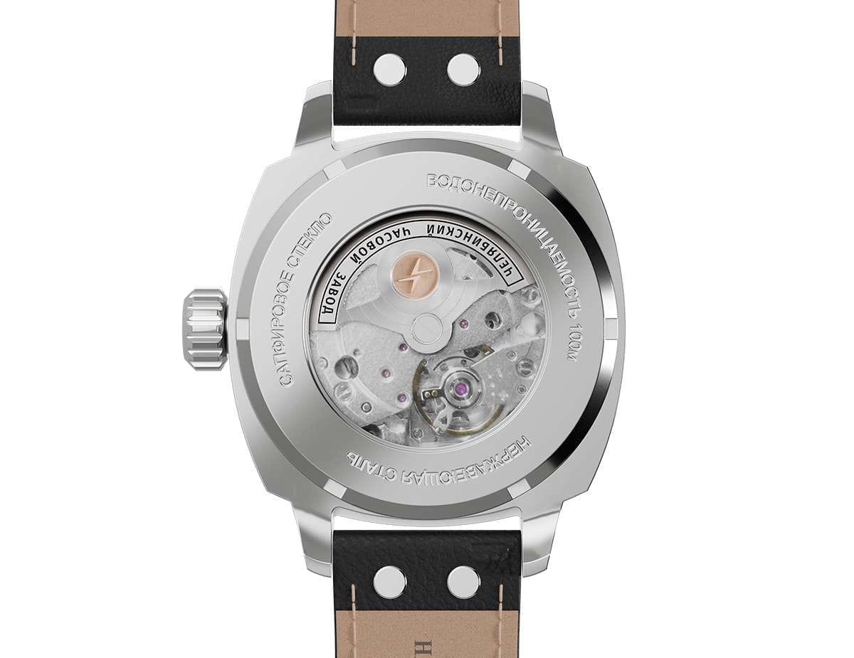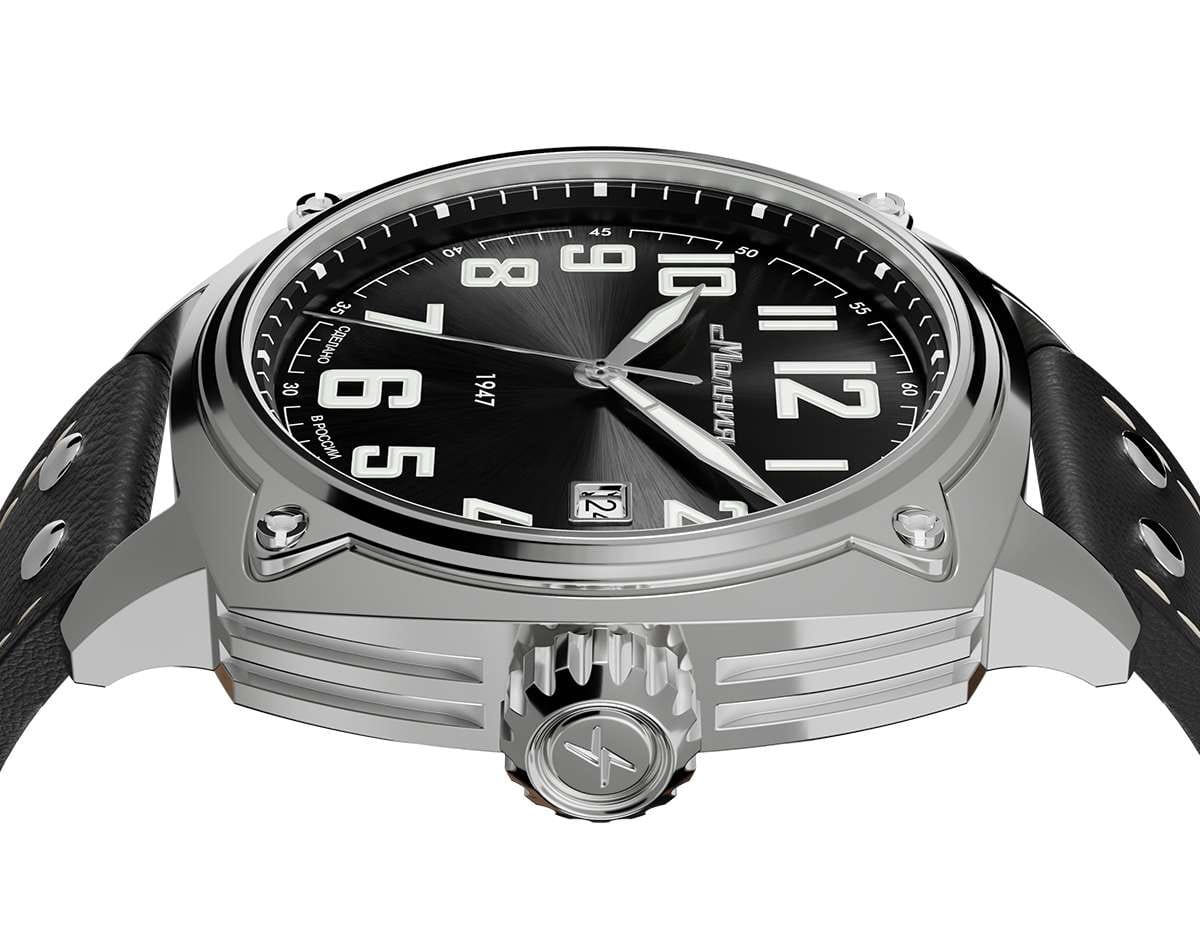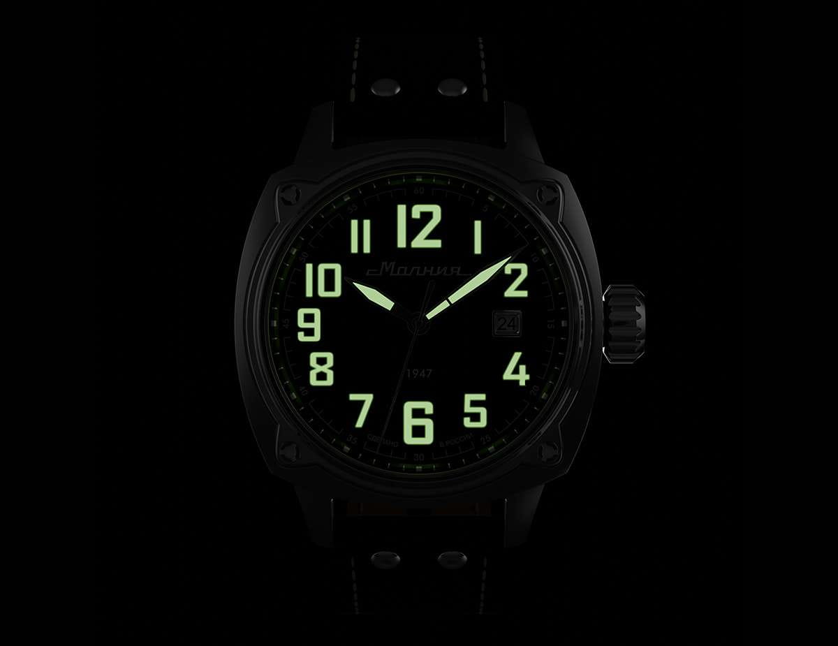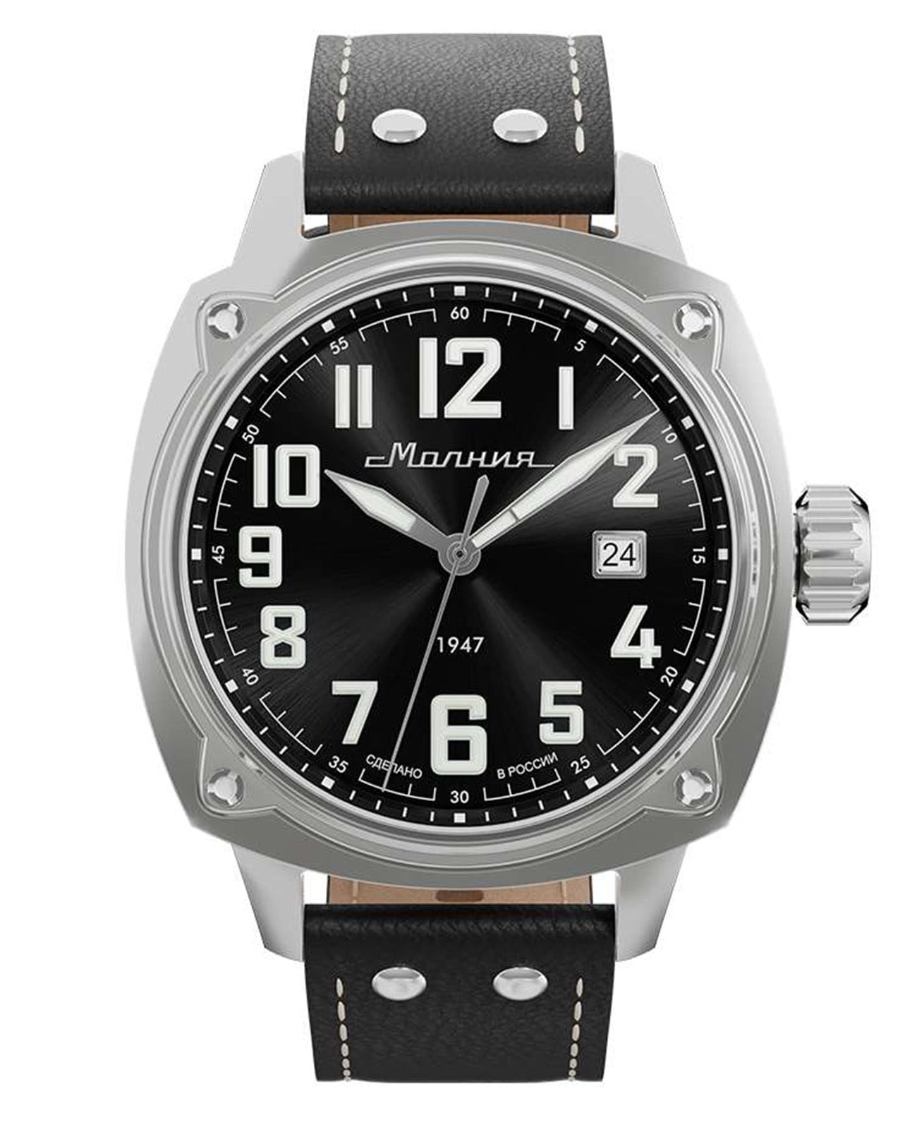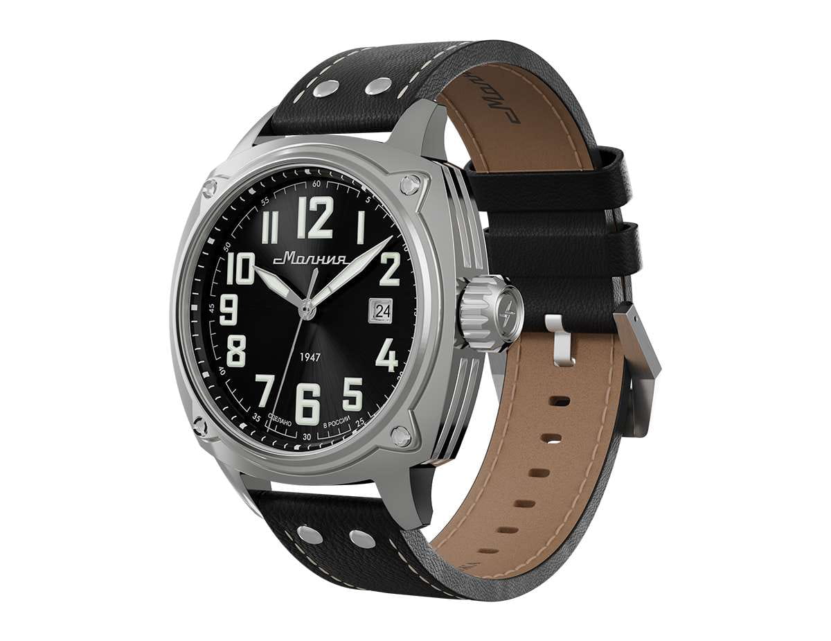 Мужские механические часы с автоподзаводом — это надёжный аксессуар от легендарного бренда «МОЛНИЯ», созданный на Челябинском часовом заводе. Корпус диаметром 42 мм выполнен из нержавеющей стали 316L с зеркальной полировкой. БезельБезельВнешний ободок, закрепляющий стекло. В спортивных часах так называется поворотное кольцо с делениями на циферблате, выполняет роль таймера – замеряет отрезки времени на шкале. Неподвижный безель – элемент декора. Однонаправленно вращающийся безель на дайверских часах позволяет фиксировать моменты погружения и выныривания на поверхность. также выполнен из стали с зеркальной отделкой. Циферблат чёрного цвета оформлен индексами и стрелками. Окошко даты расположено в положении 3 часов. Стрелки и метки с люминесцентным покрытиемЛюминесцентное покрытиеПозволяет считывать показания времени в темноте. Производители наносят на стрелки, часовые индексы, безель или поверхность циферблата светонакопительный состав, дающий холодное свечение. Super-LumiNova, обеспечивающим хорошую читаемость в темноте. Циферблат защищён сапфировым стекломСапфировое стеклоПрочный и надёжный материал из кристалла сапфира синтетического происхождения, характеризующийся особой твёрдостью и устойчивостью к царапинам и повреждениям. с антибликовым покрытиемАнтибликовое покрытиеСлой оксида металла в 0,13-0,3 микрон, благодаря которому стекло часов не бликует и не отражает свет. Антибликовое покрытие уменьшает отражение света в 10 раз, обеспечивая отличную читаемость показателей циферблата.. Механизм — японский автоматический калибр Miyota 8215 с функцией и запасом хода до 42 часов. Прозрачная задняя крышка позволяет наблюдать за работой механизма. Часы оснащены кожаным ремешком чёрного цвета с белой отстрочкой и классической пряжкой. Водонепроницаемость 100 м позволяет использовать часы для плавания и повседневного ношения. Идеальный выбор для тех, кто ценит качество, точность и стиль.