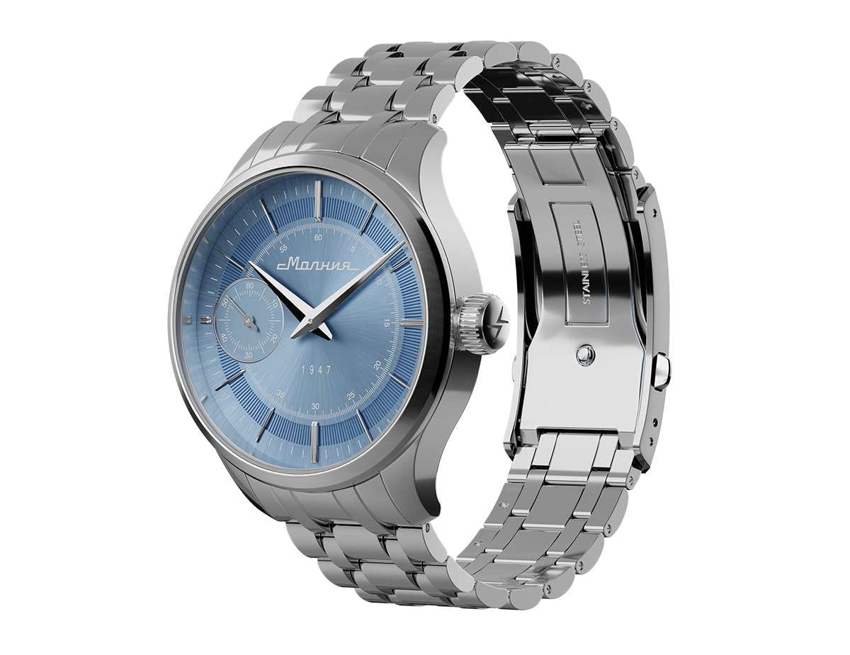 Мужские механические часы с ручным подзаводом — это аксессуар от легендарного бренда «МОЛНИЯ», созданный на Челябинском часовом заводе. Корпус диаметром 41 мм выполнен из нержавеющей стали 316L с зеркальной полировкой. БезельБезельВнешний ободок, закрепляющий стекло. В спортивных часах так называется поворотное кольцо с делениями на циферблате, выполняет роль таймера – замеряет отрезки времени на шкале. Неподвижный безель – элемент декора. Однонаправленно вращающийся безель на дайверских часах позволяет фиксировать моменты погружения и выныривания на поверхность. также выполнен из стали с зеркальной отделкой. Циферблат голубого цвета оформлен индексами и стрелками. Малая секундная стрелка вынесена на позицию 9 часов. Циферблат защищён сапфировым стекломСапфировое стеклоПрочный и надёжный материал из кристалла сапфира синтетического происхождения, характеризующийся особой твёрдостью и устойчивостью к царапинам и повреждениям. толщиной 2 мм. Механизм — мануфактурный калибр 3603, собранный вручную, с запасом хода до 40 часов. Прозрачная задняя крышка позволяет наблюдать за работой механизма. Часы оснащены стальным браслетом с раскладной застёжкойРаскладная застёжкаТакой тип застёжки используется только на браслетах из металла. Она никогда не раскрывается полностью, происходит разделение на 2 и более частей. Раскладывающая застёжка снизит вероятность потери часов к минимуму. с кнопочным открытием и системой быстрой замены. Водонепроницаемость 50 м позволяет использовать часы в повседневных условиях. Идеальный выбор для тех, кто ценит российское качество и традиции.